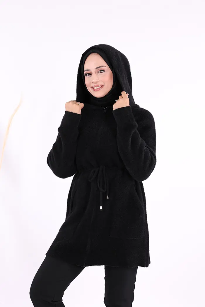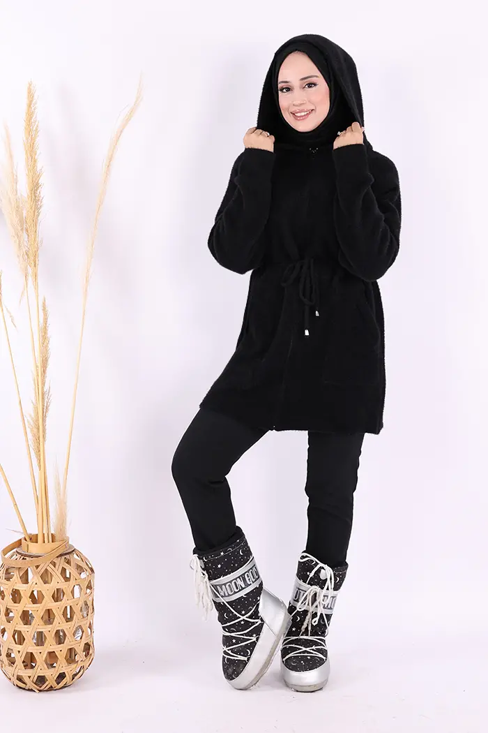 Cepli ve Fermuar Detaylı Sakallı Hırka 12659 Siyah