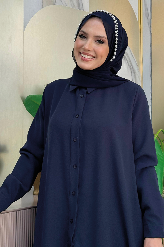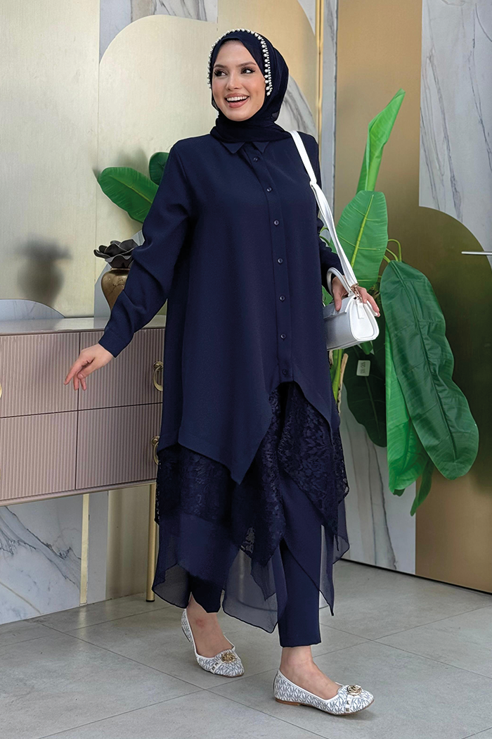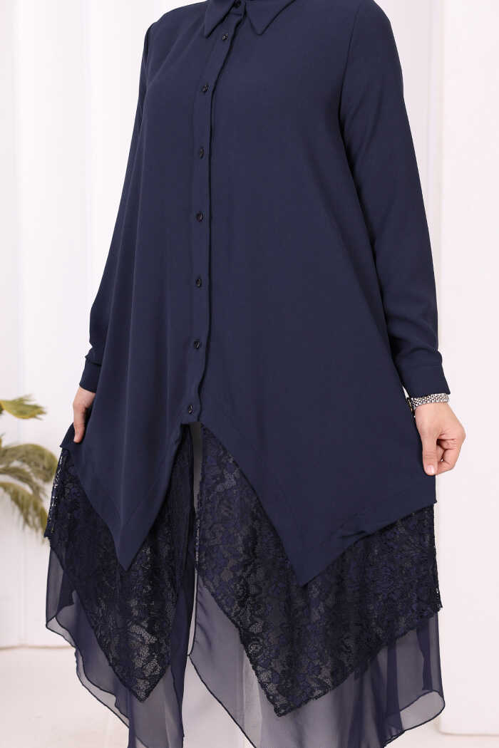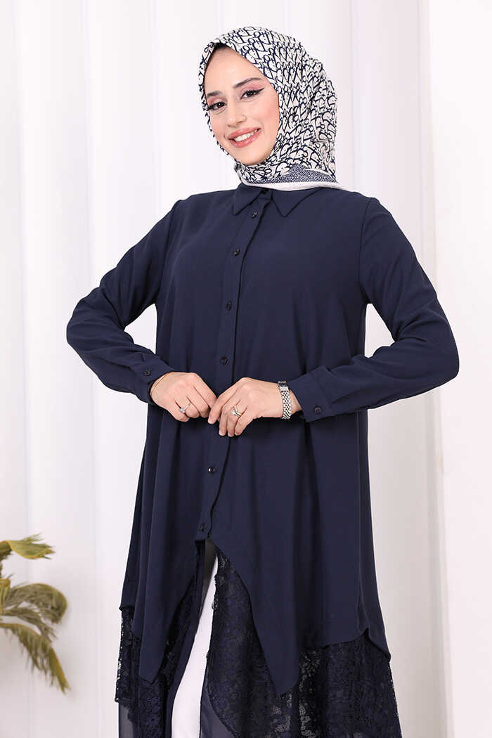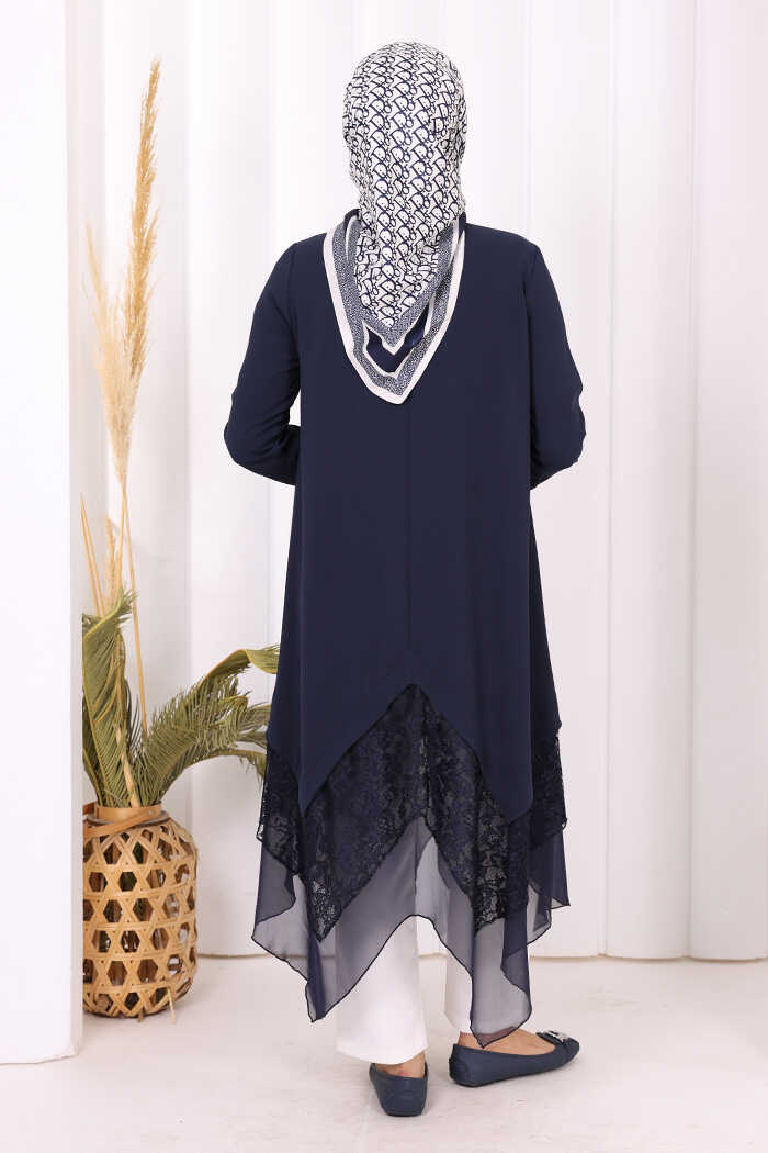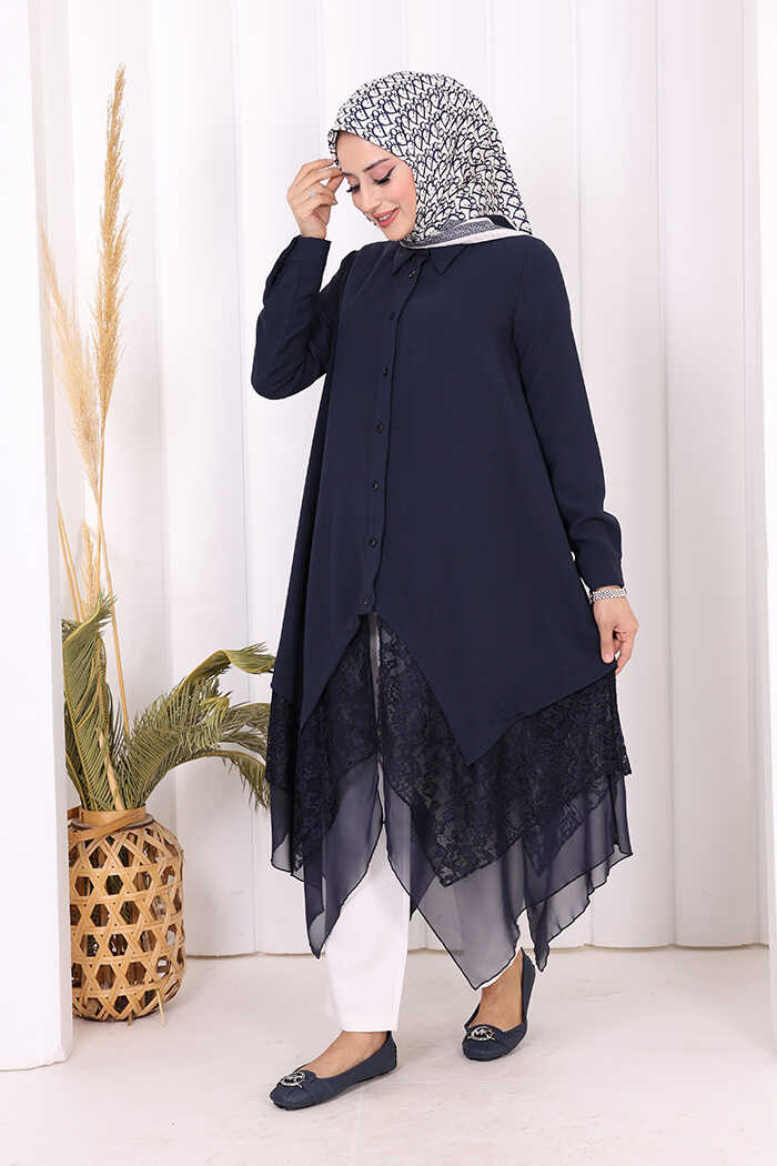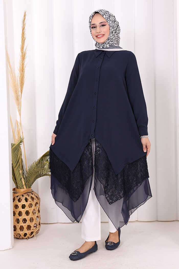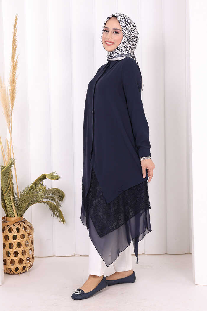 Dantel Ve Şifon Detaylı Asimetrik Kesim Tunik 2758 Lacivert
