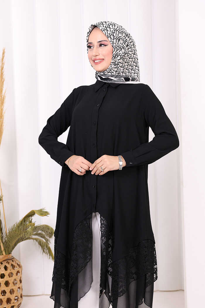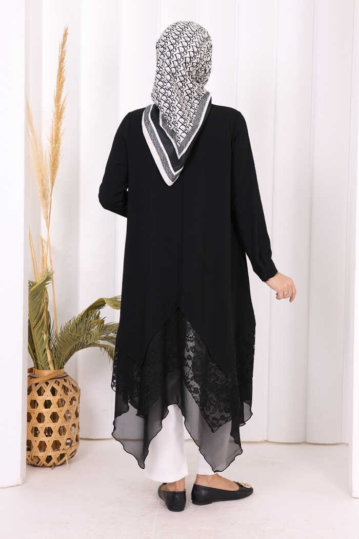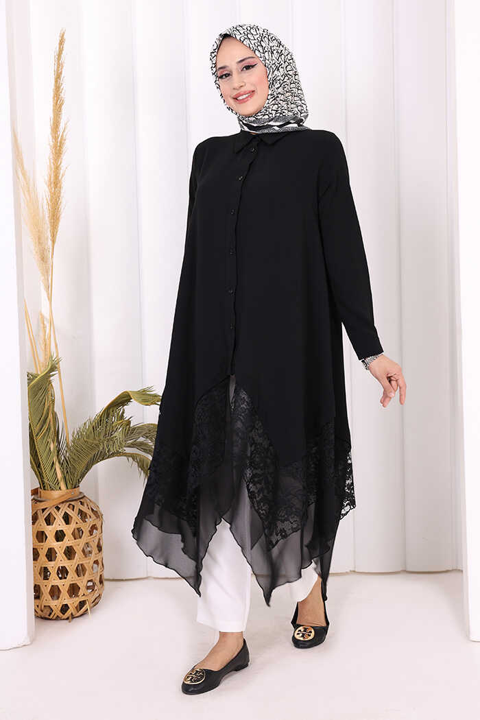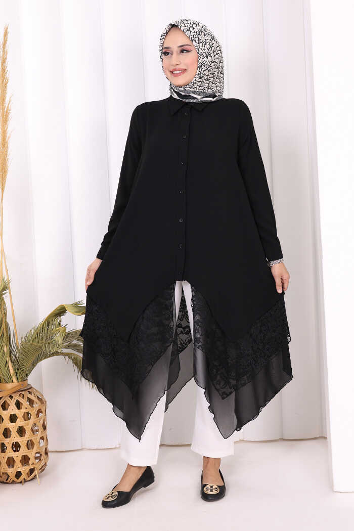 Dantel Ve Şifon Detaylı Asimetrik Kesim Tunik 2758 Siyah