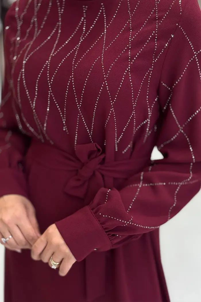 Taş İşlemeli Kuşaklı Elbise 3830 Bordo