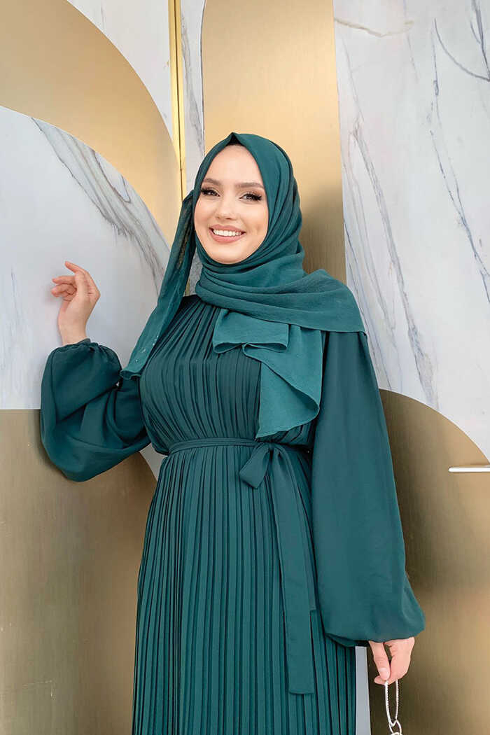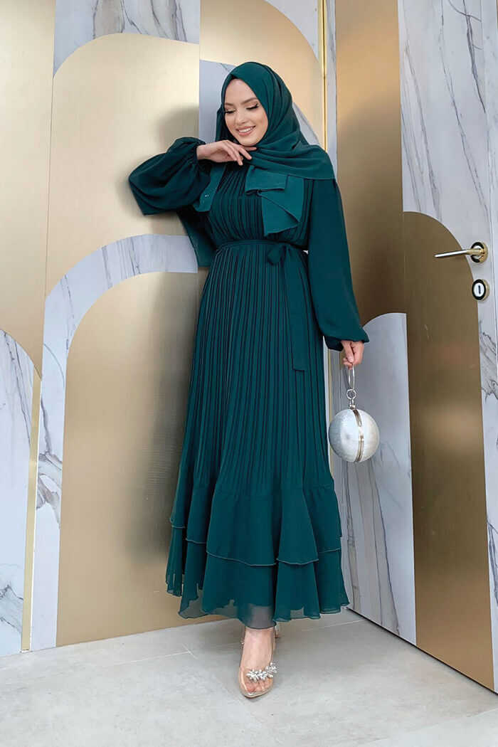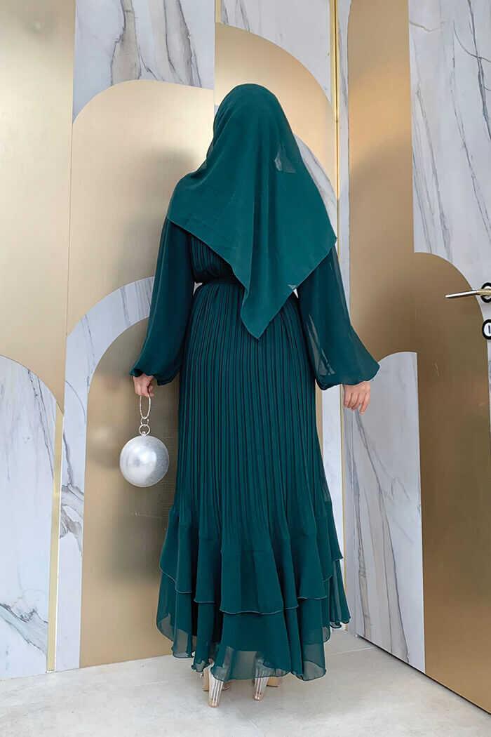 Piliseli Kat Kat Detaylı Astarlı Elbise 3836 Zümrüt