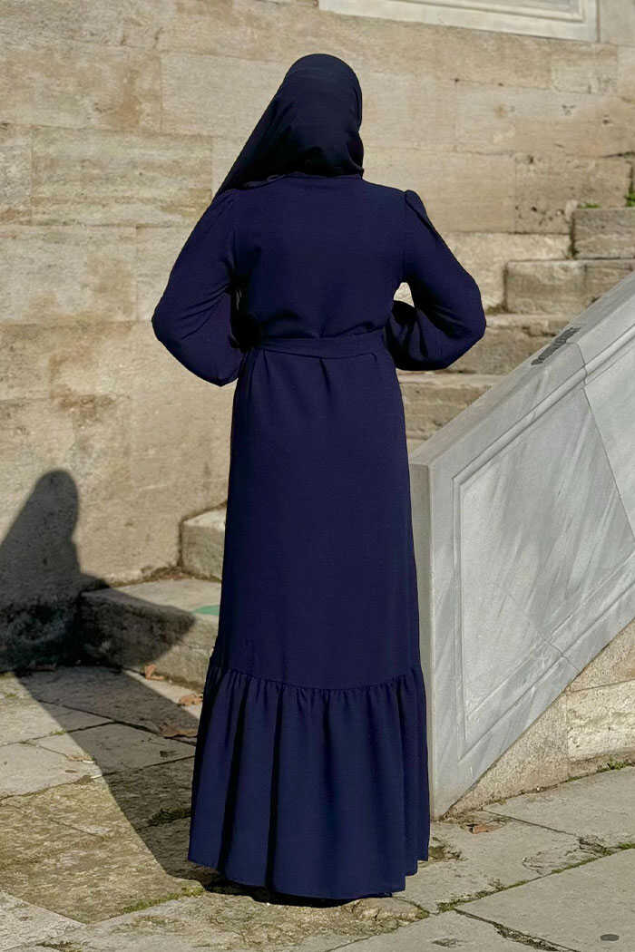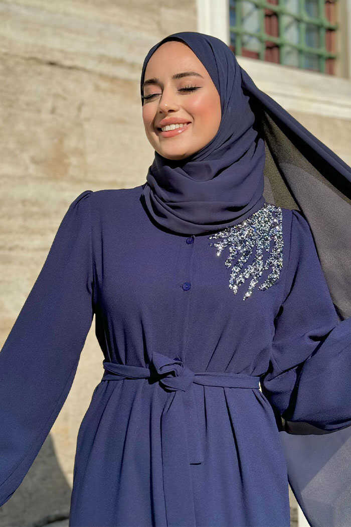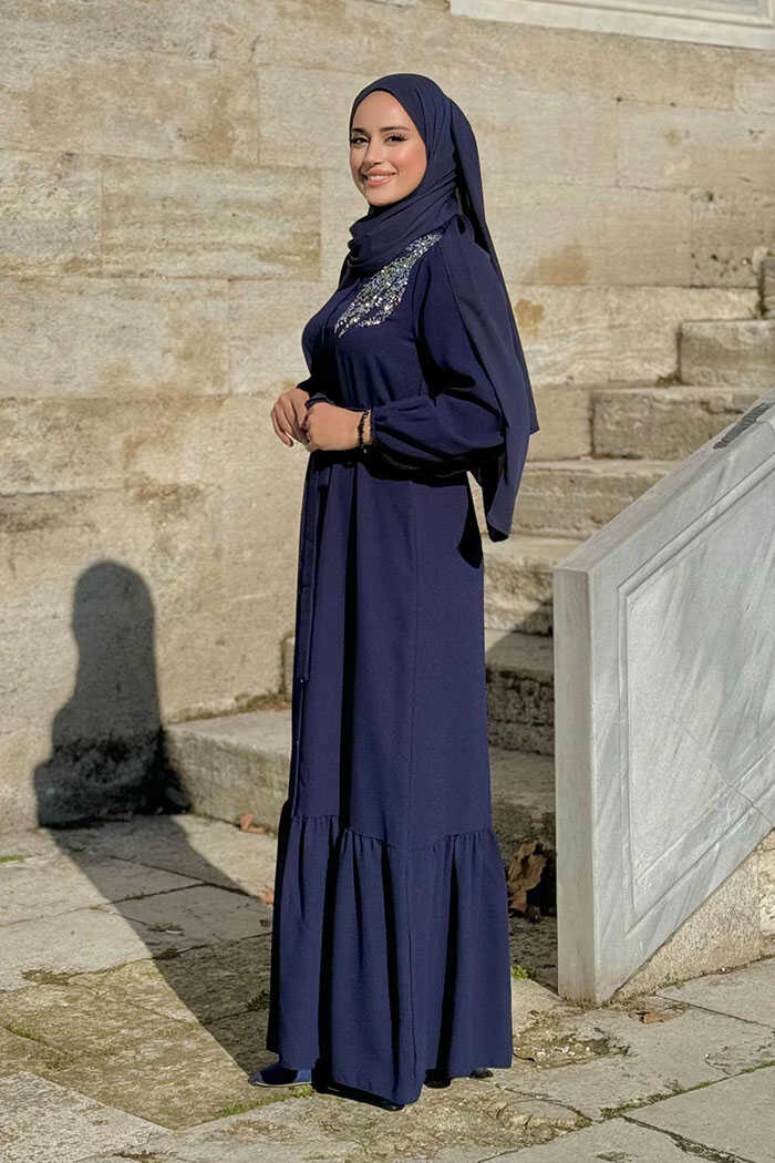 Boydan Düğmeli Omuz Taş İşleme Detaylı Ferace Elbise 3840 Lacivert