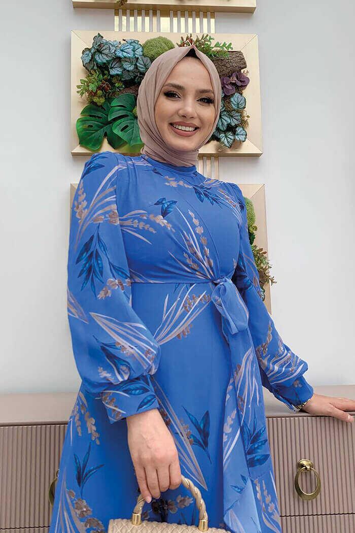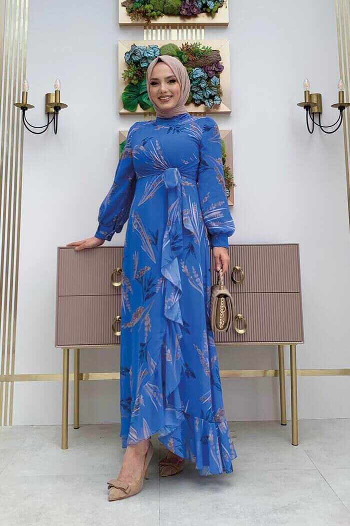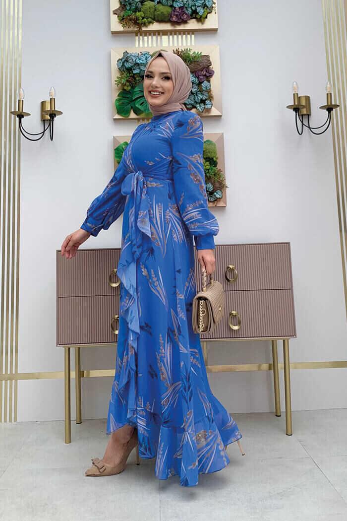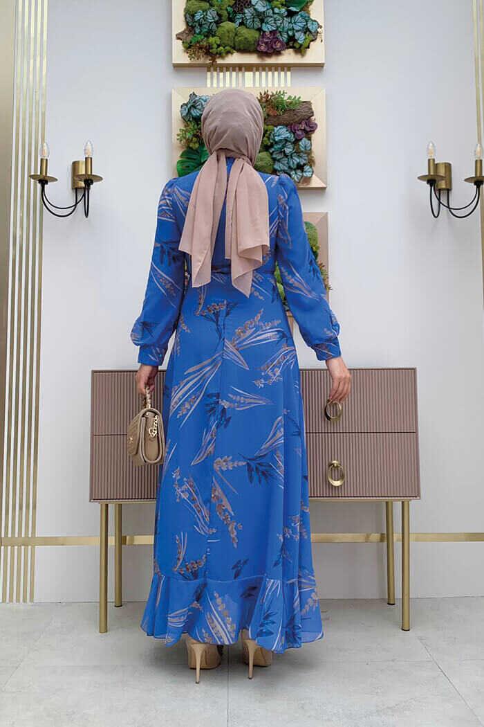 Yaprak Desen Fırfır Detay Şifon Elbise 3842 Mavi