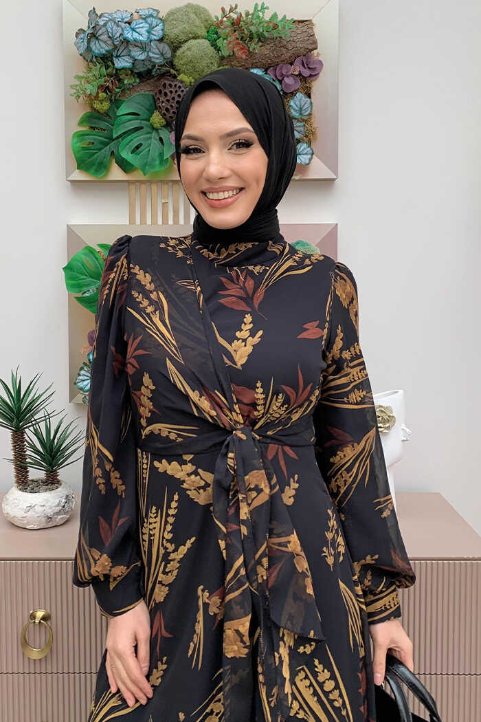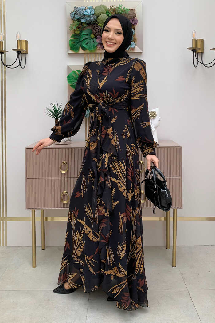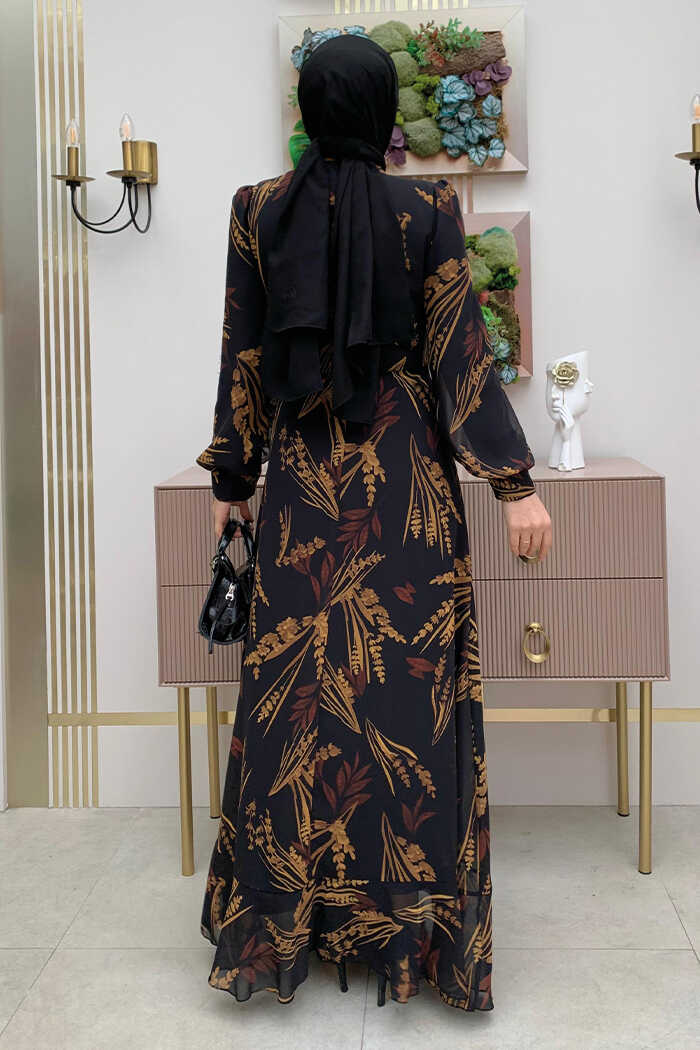 Yaprak Desen Fırfır Detay Şifon Elbise 3842 Siyah