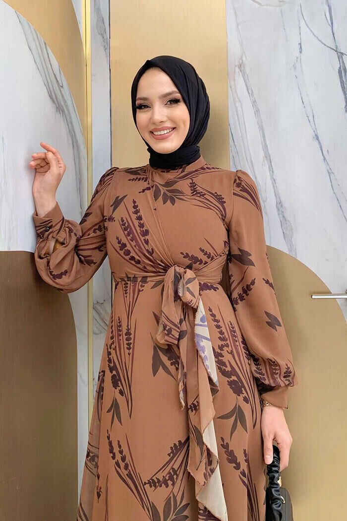 YAPRAK DESENLİ FIRFIR DETAY ELBİSE