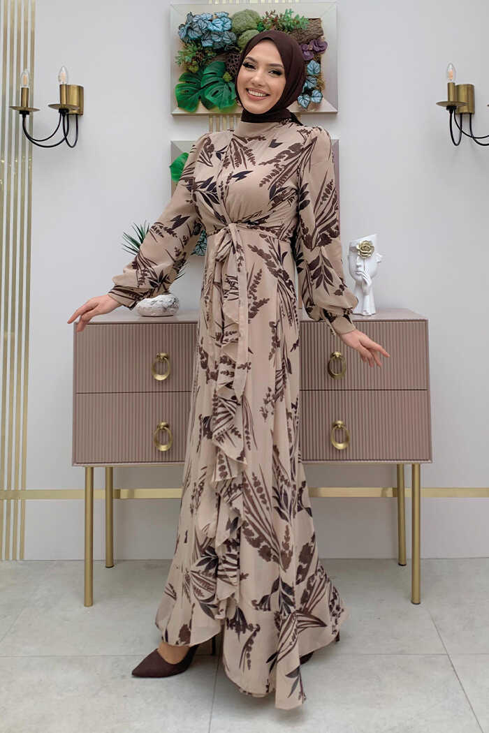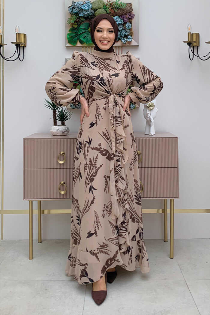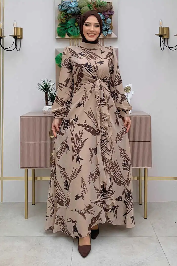 YAPRAK DESENLİ FIRFIR DETAY ELBİSE