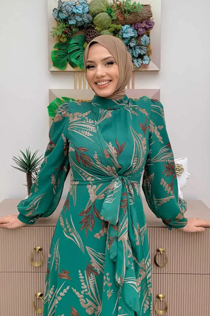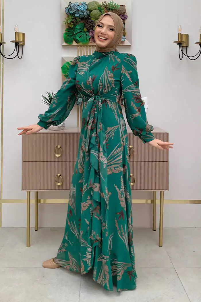 Yaprak Desen Fırfır Detay Şifon Elbise 3842 Zümrüt
