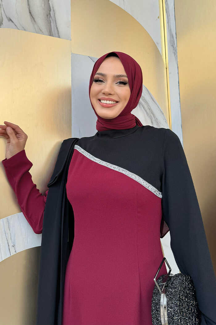 Tek Omuz Fiyonk Apoletli Çift Renk Elbise 3862 Bordo