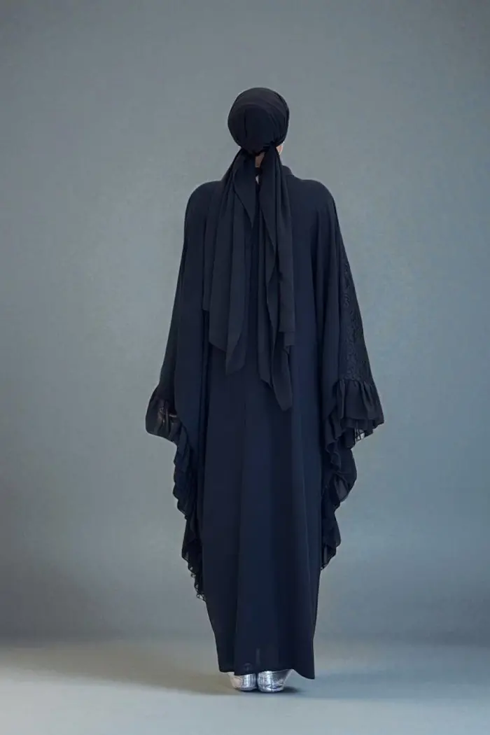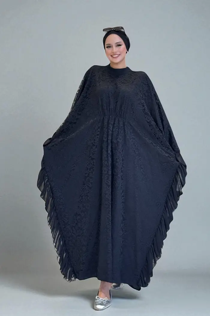 Uçları Şifon Fırfır Görünümlü Dantel Elbise 3864 Siyah