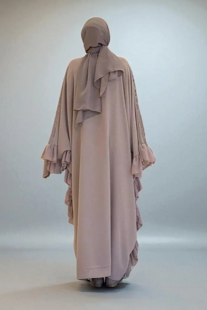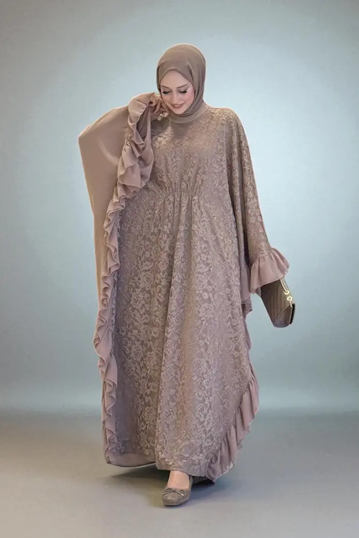 Uçları Şifon Fırfır Görünümlü Dantel Elbise 3864 Vizon