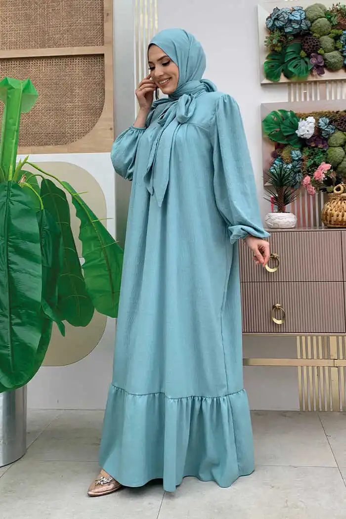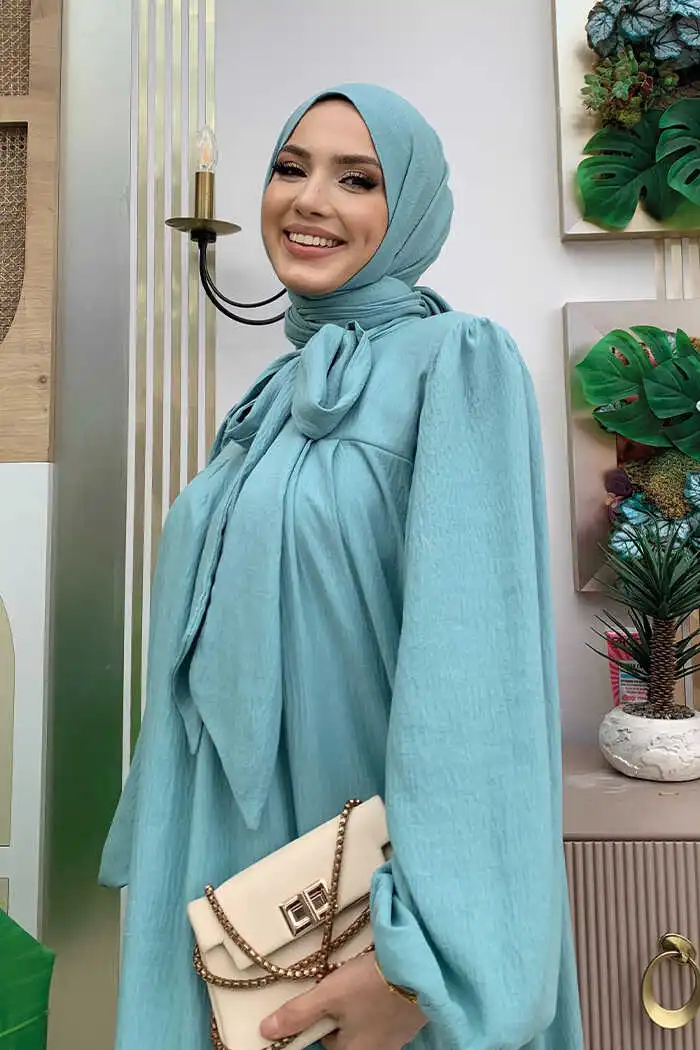 Yakası Bağlama Detaylı Şal Elbise İkili Takım 3885 Mint
