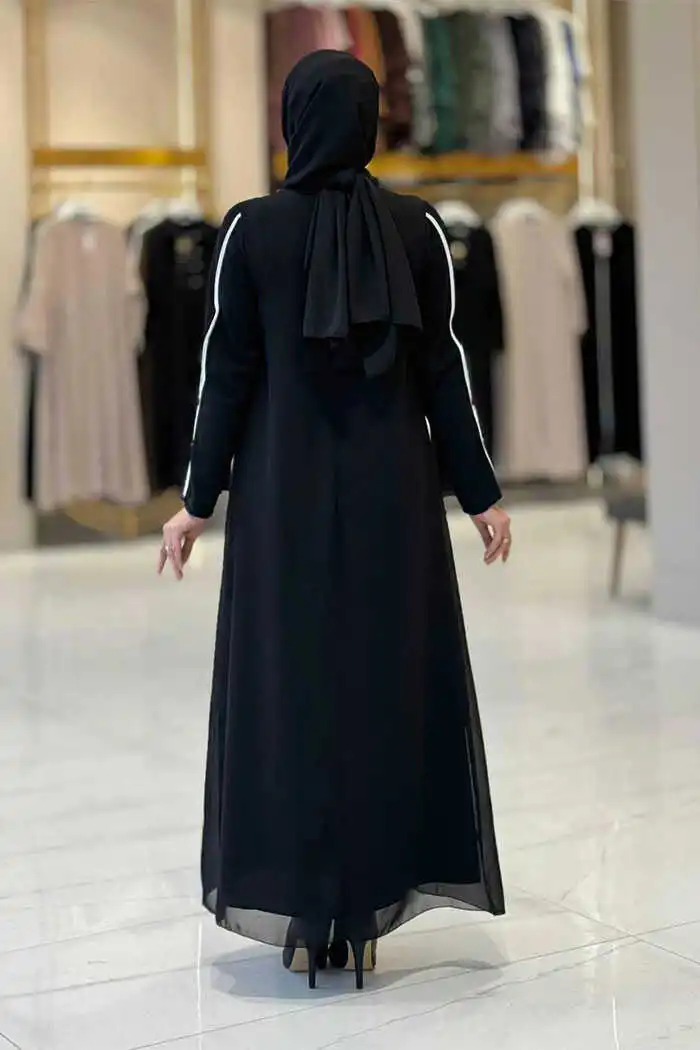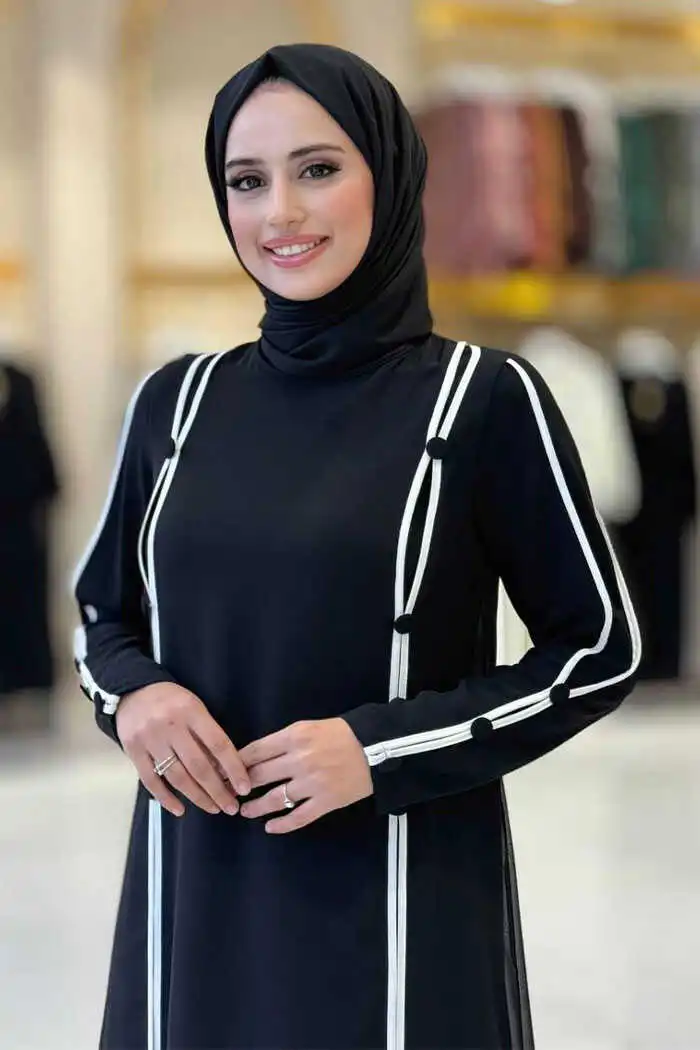 Büyük Beden Düğme Detaylı Elbise 3919-1 Siyah-Ekru