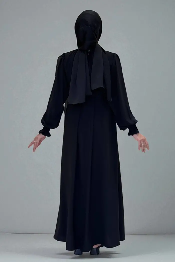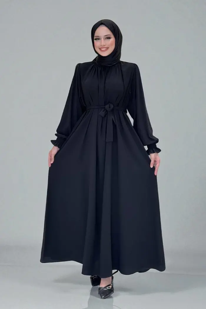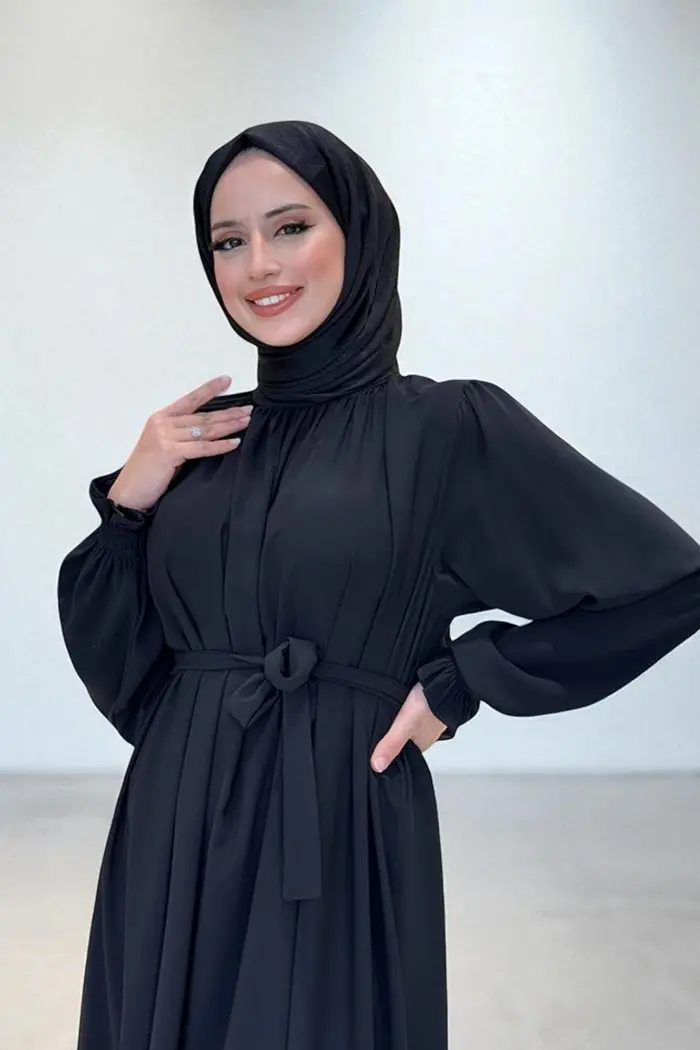 Yaka ve Kol Manşetleri Büzgü Görünümlü Kuşaklı Elbise 6014 Siyah