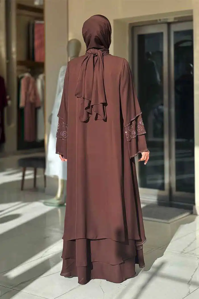 Taş Detaylı Şal ve Abaya İkili Takım 70001 Kahverengi
