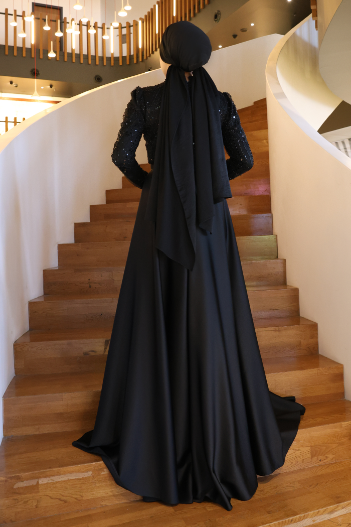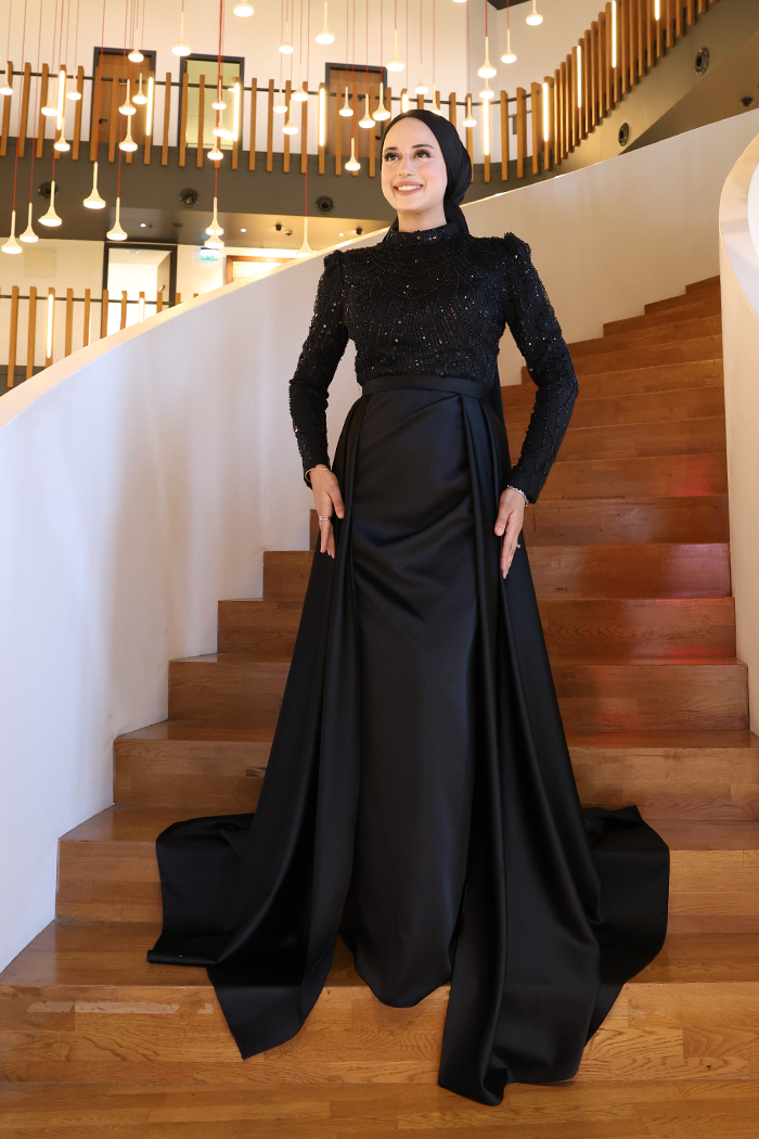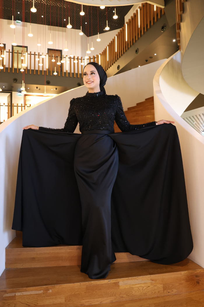 Kolları Pelerinli Taş Detaylı Abiye Elbise 3958 Lacivert