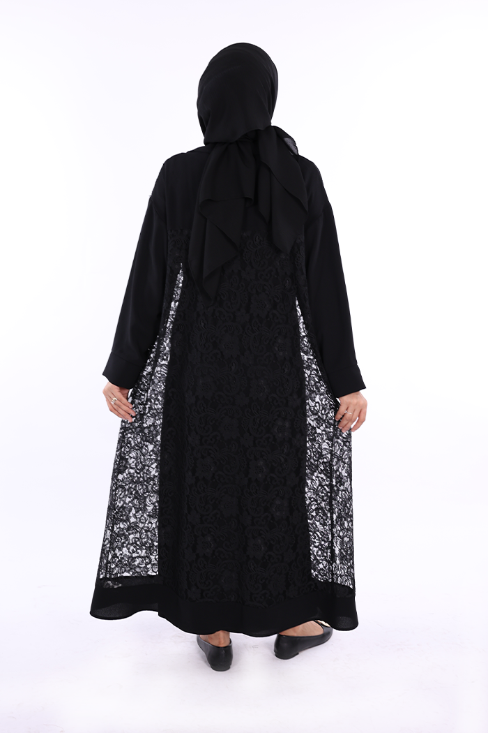 Yakalı Dantel Güpür Detay Abaya 7830 Siyah