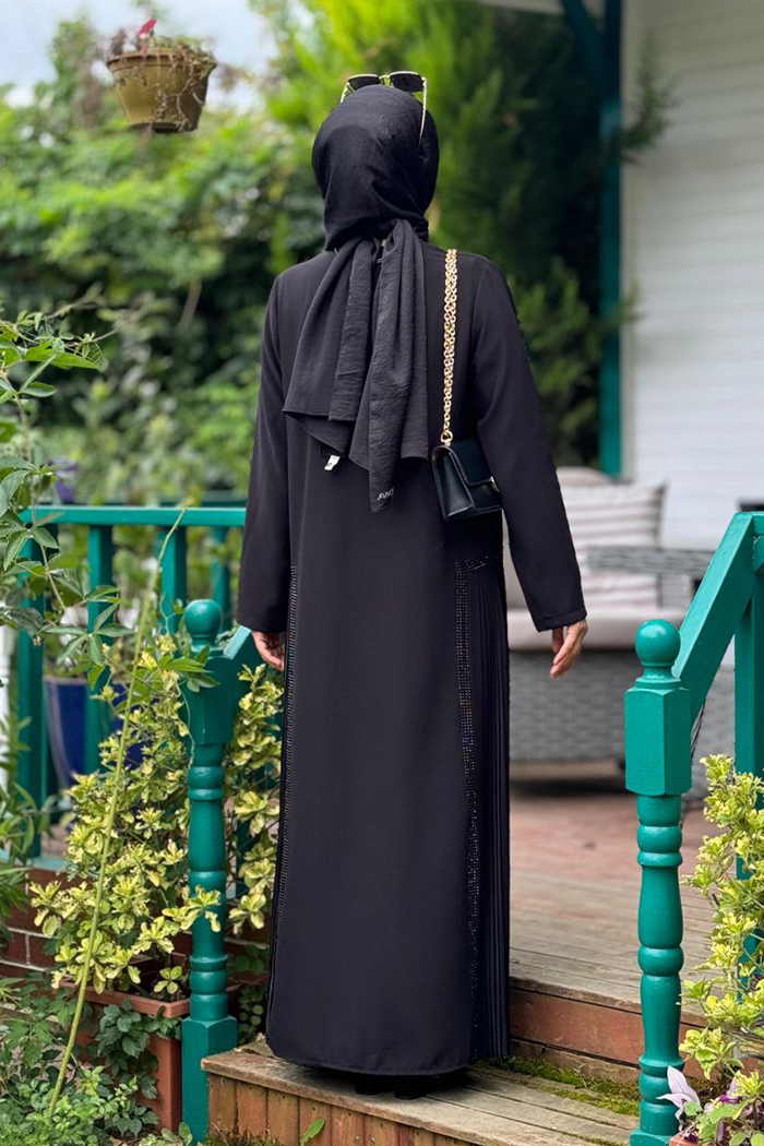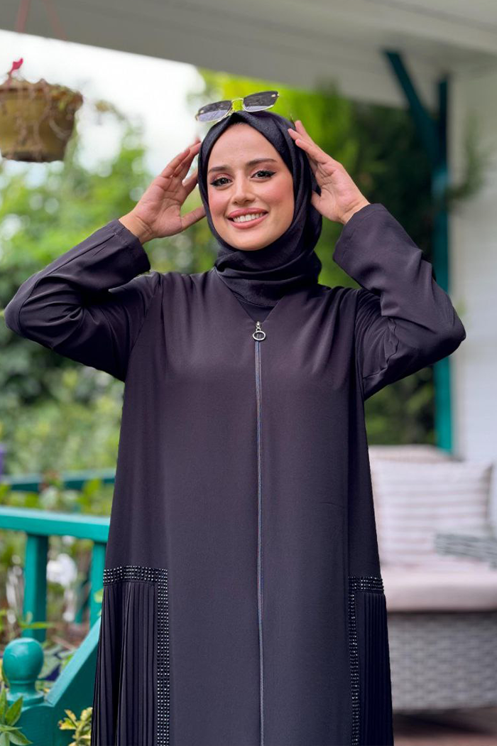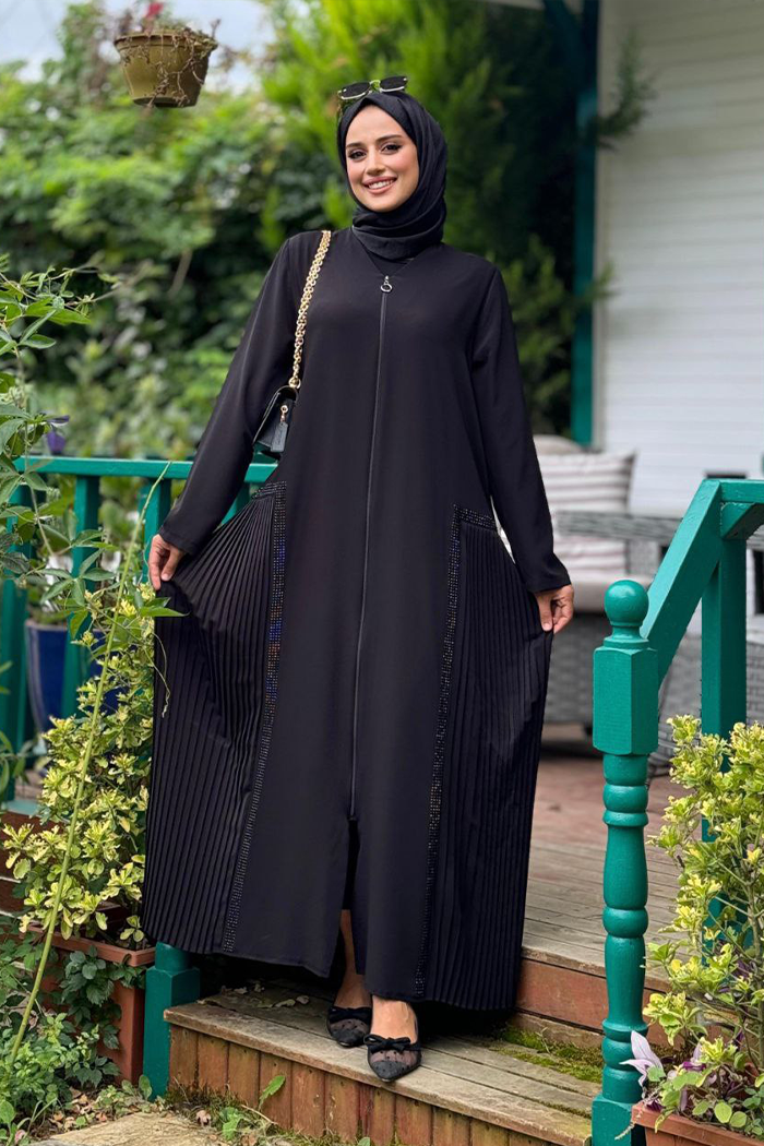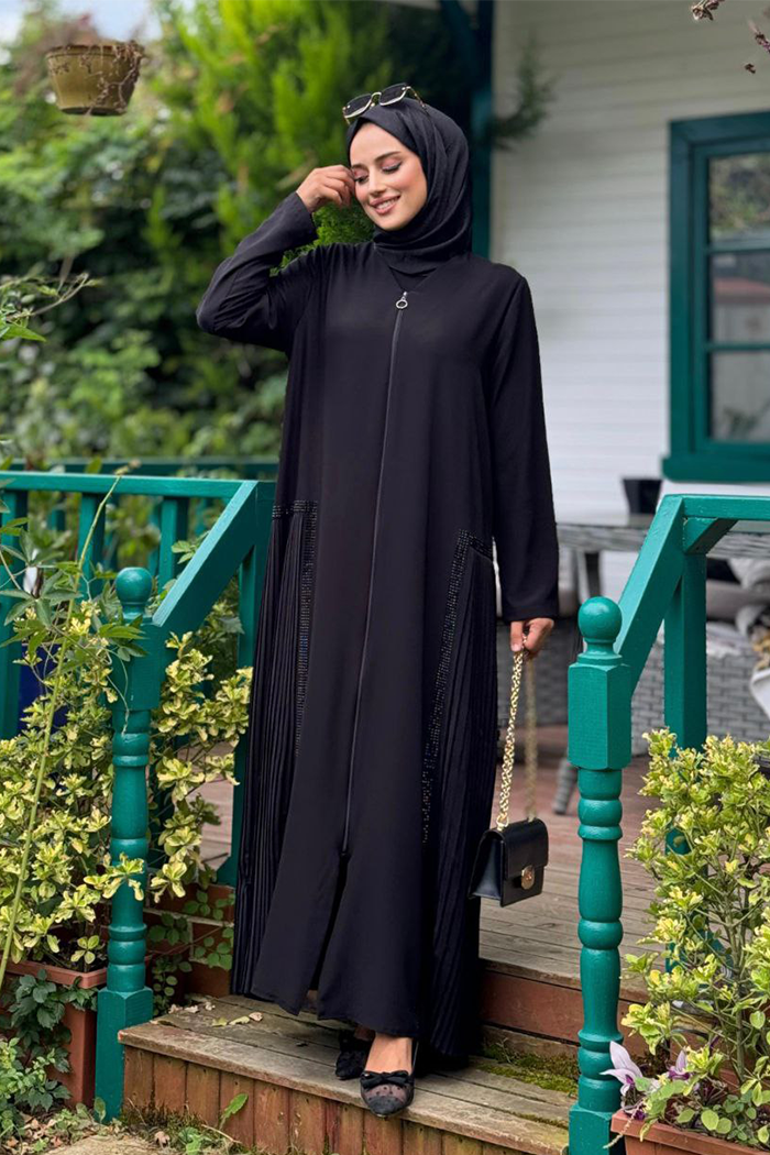 Pilise Taş Detay Fermuarlı Ferace 7892 Siyah