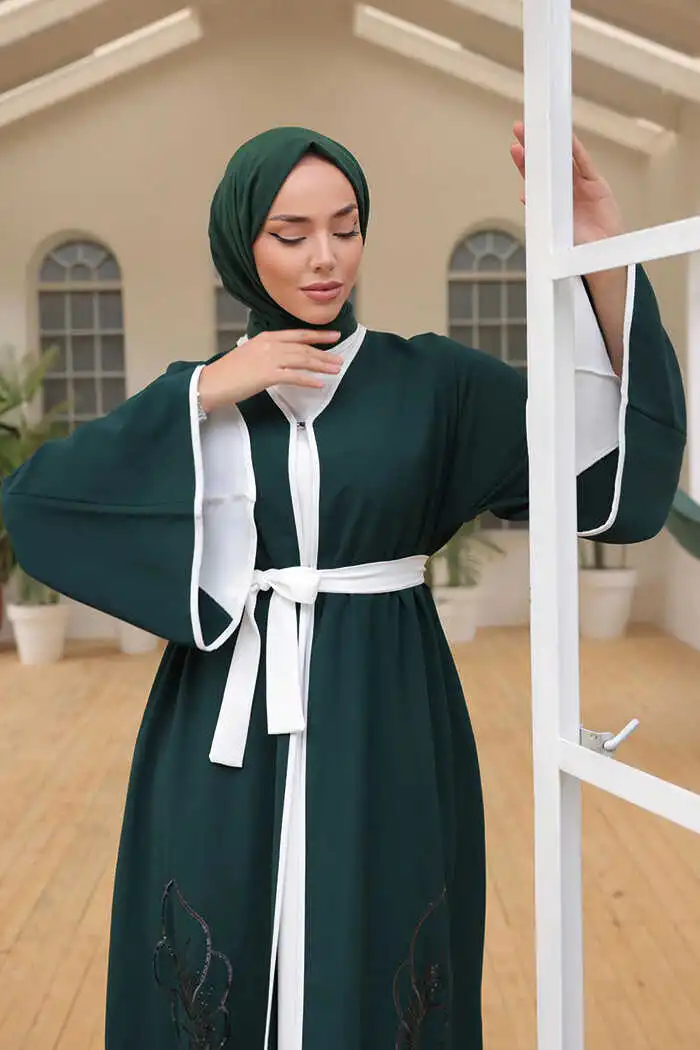 Nakış İşleme Detaylı Bel Kuşaklı Abaya 7901 Zümrüt
