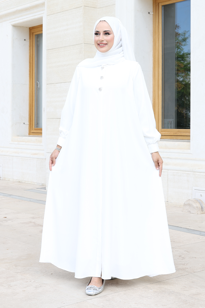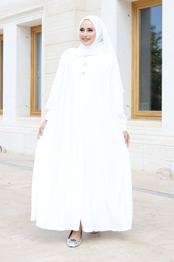 Boydan Düğmeli Taş İşleme Detaylı Ferace 7903 Ekru