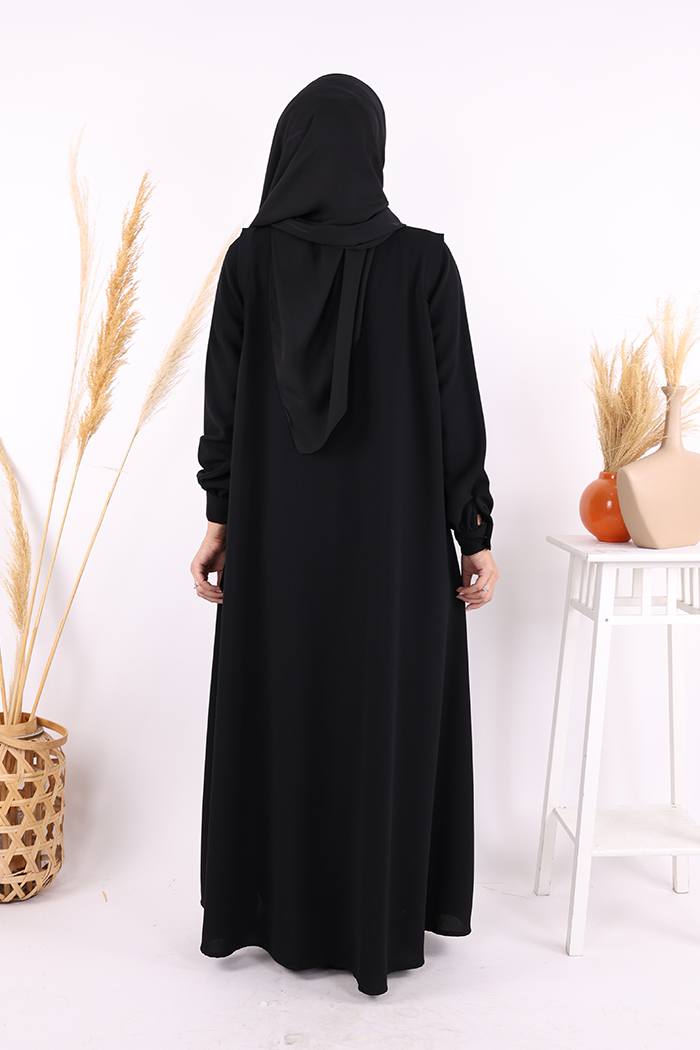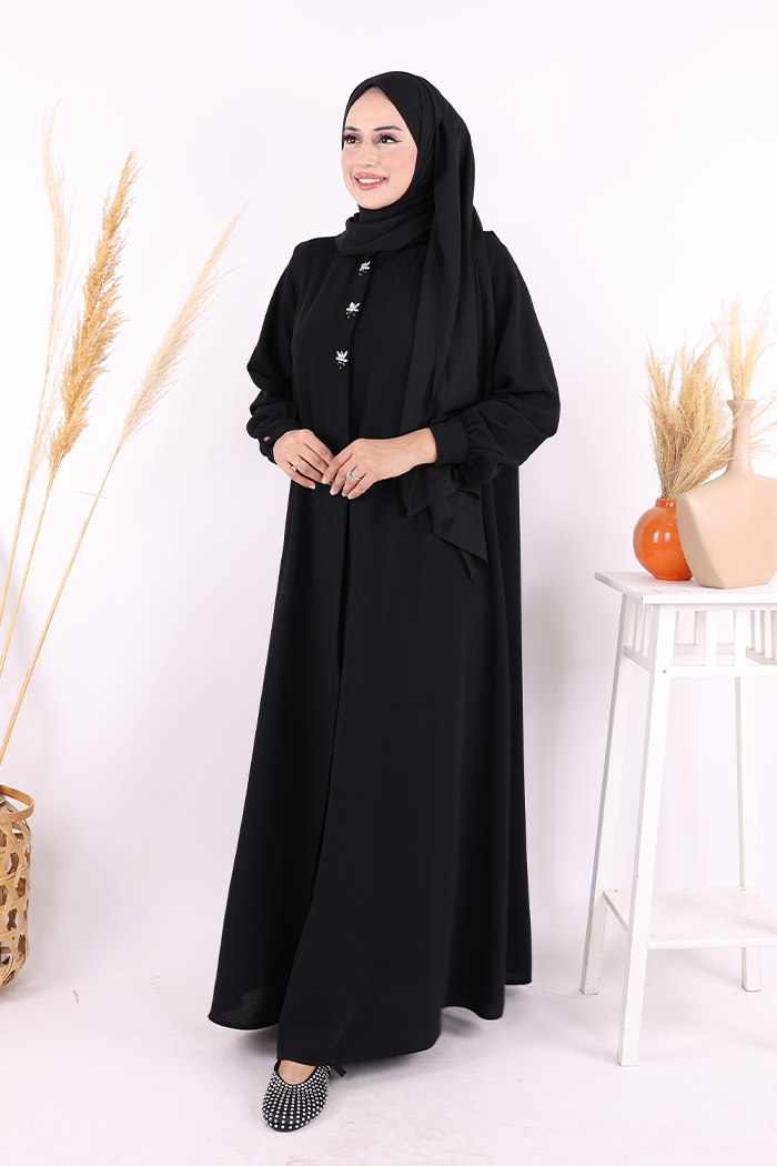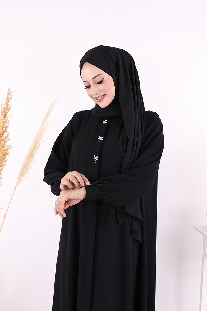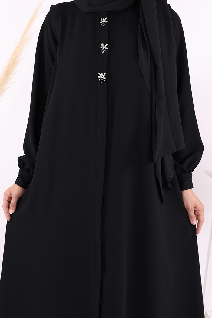 Boydan Düğmeli Taş İşleme Detaylı Ferace 7903 Siyah