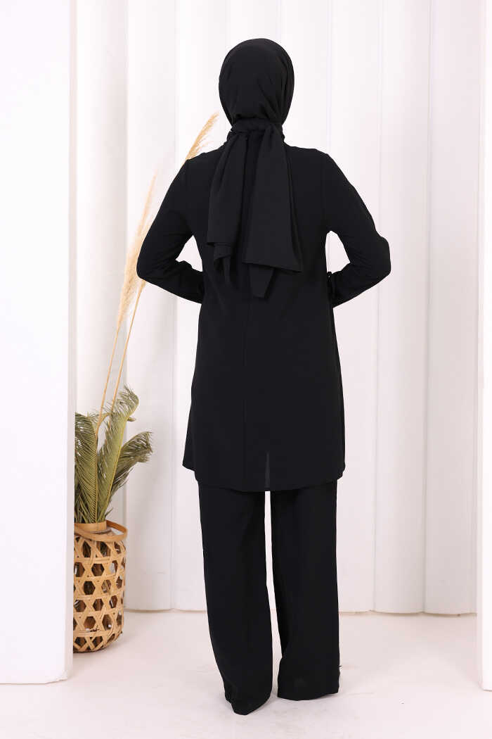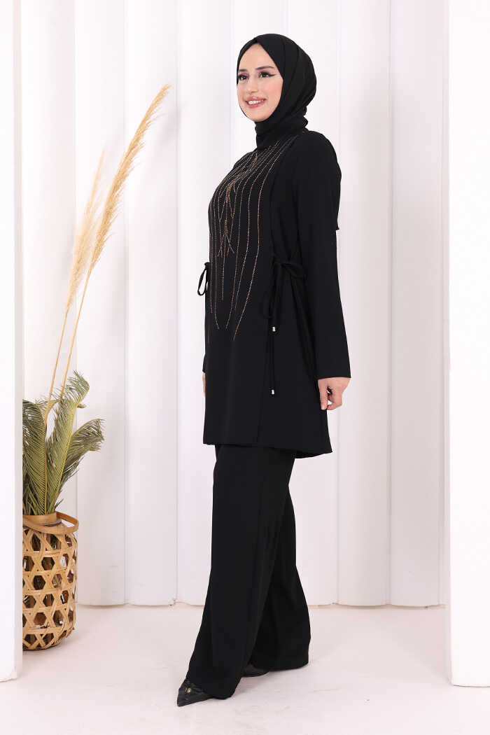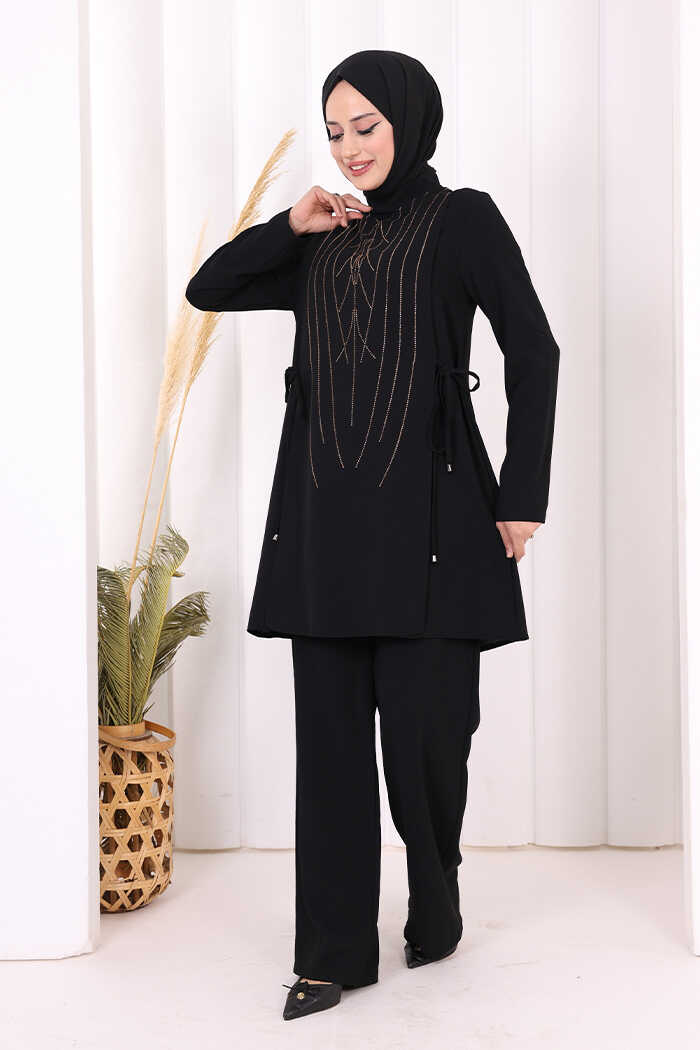 Taş Baskı Desenli Tunik Pantolon Takım 8447 Siyah