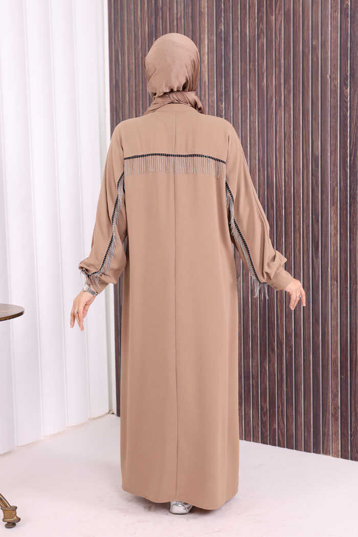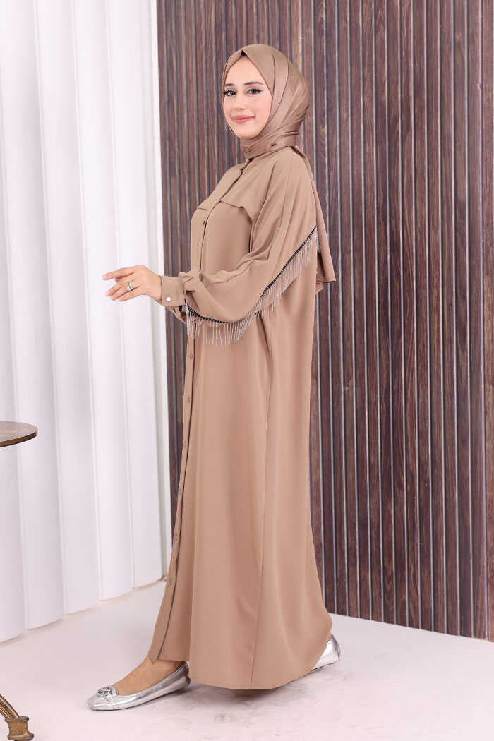 Arkası Zincir Püskül Detay Boydan Düğmeli Yarasakol Ferace 7822 Vizon