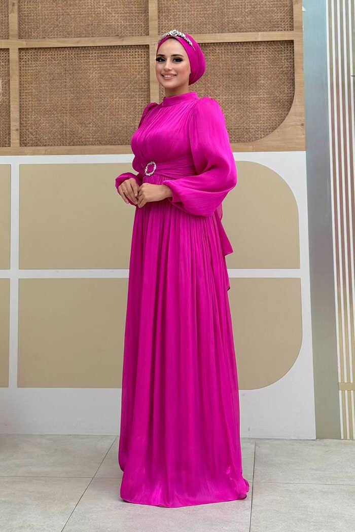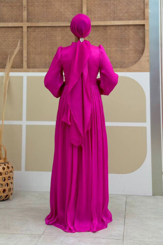 Balon Kol Pileli Abiye Elbise 7013 Fuşya