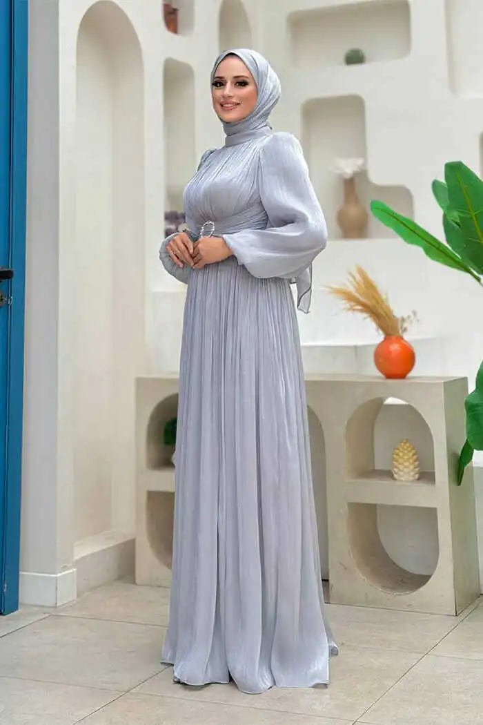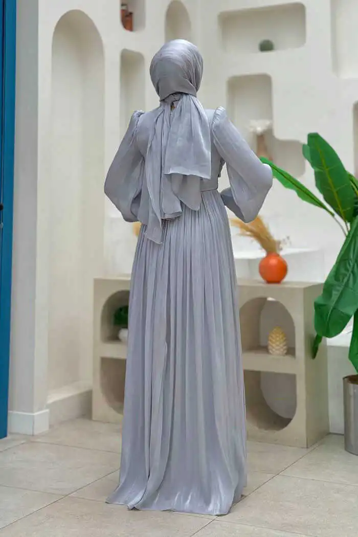 Balon Kol Pileli Abiye Elbise 7013 Gri