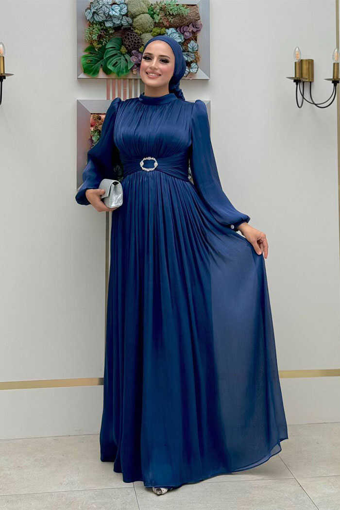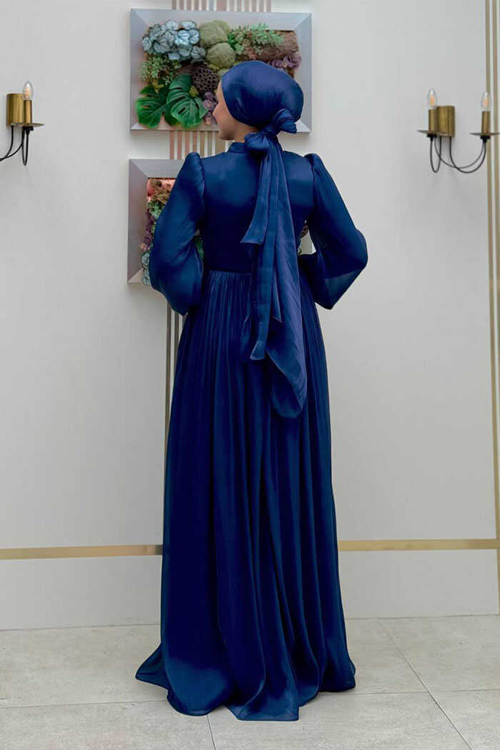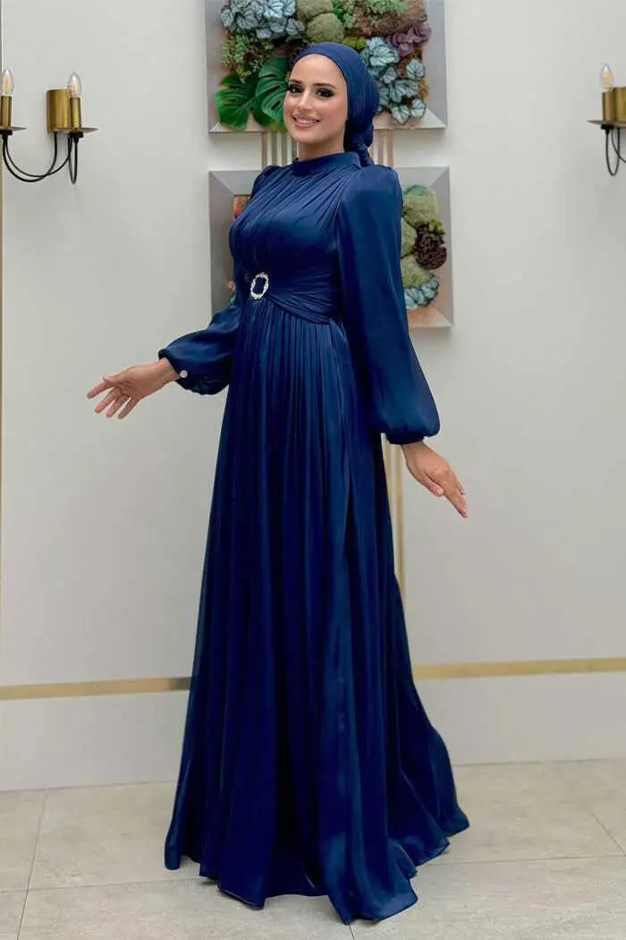 Balon Kol Pileli Abiye Elbise 7013 Lacivert