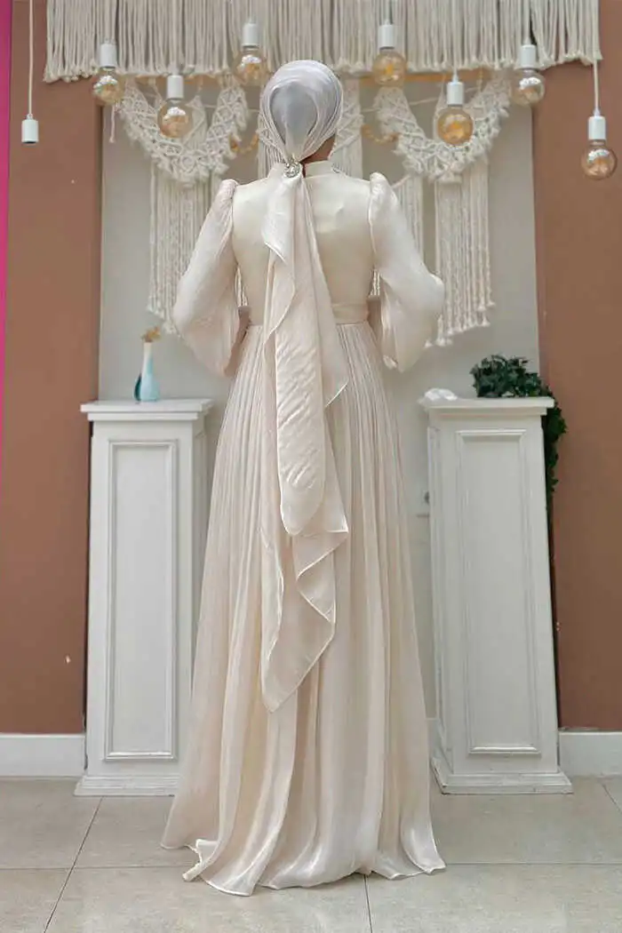 Balon Kol Pileli Abiye Elbise 7013 Taş