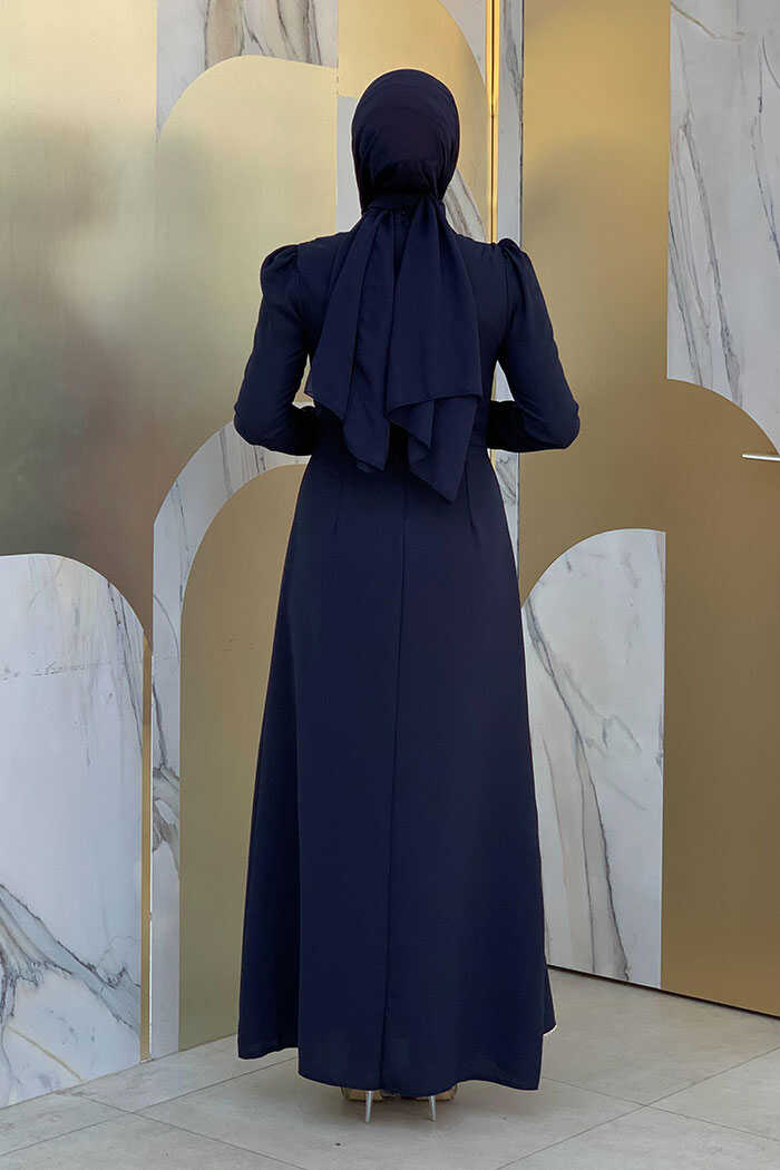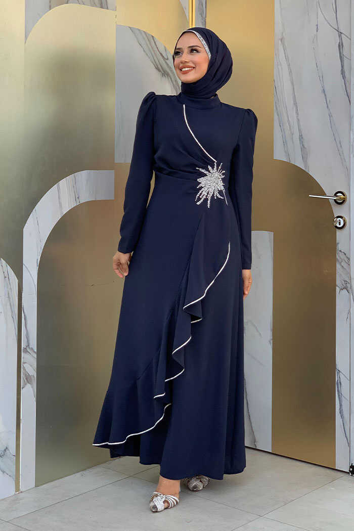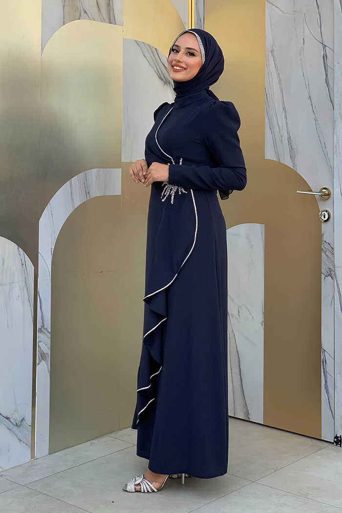 BEL KISMI TAŞ İŞLEMELİ FIRFIR GÖRÜNÜMLÜ ABİYE ELBİSE