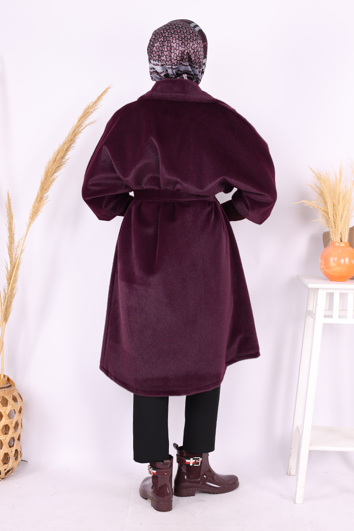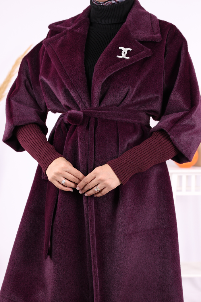 BEL KUŞAKLI YAKA TAŞ BROŞ DETAYLI KABAN: