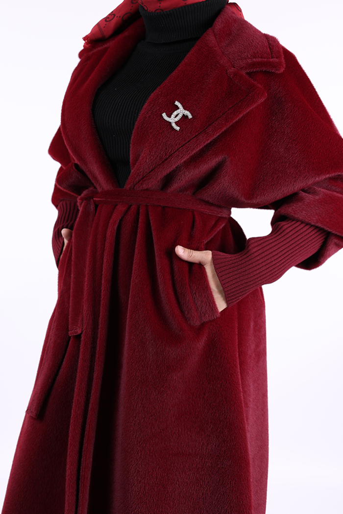 BEL KUŞAKLI YAKA TAŞ BROŞ DETAYLI UZUN KABAN: