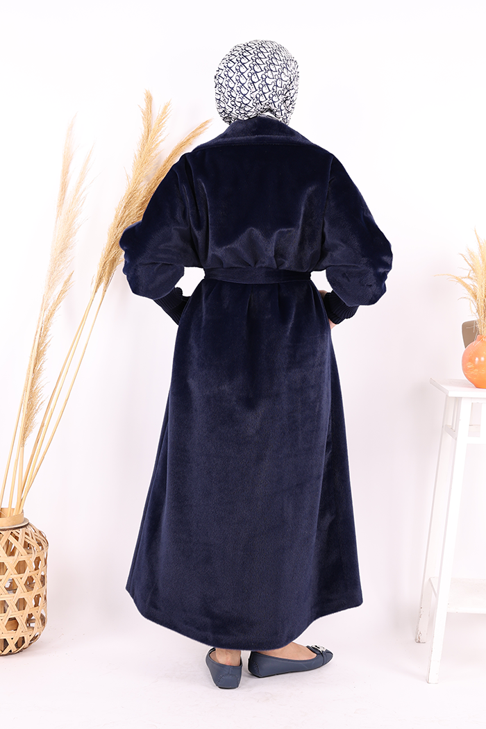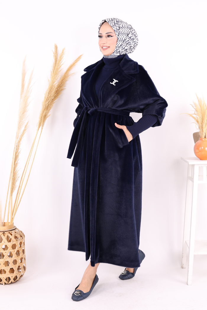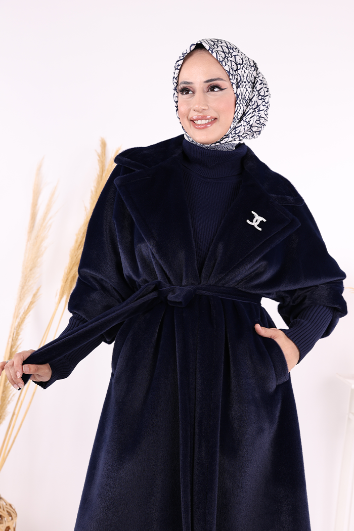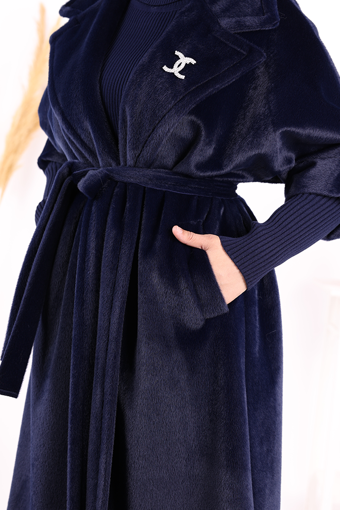Bel Kuşaklı Yaka Taş Broş Detaylı Uzun Kaban 7923 Lacivert