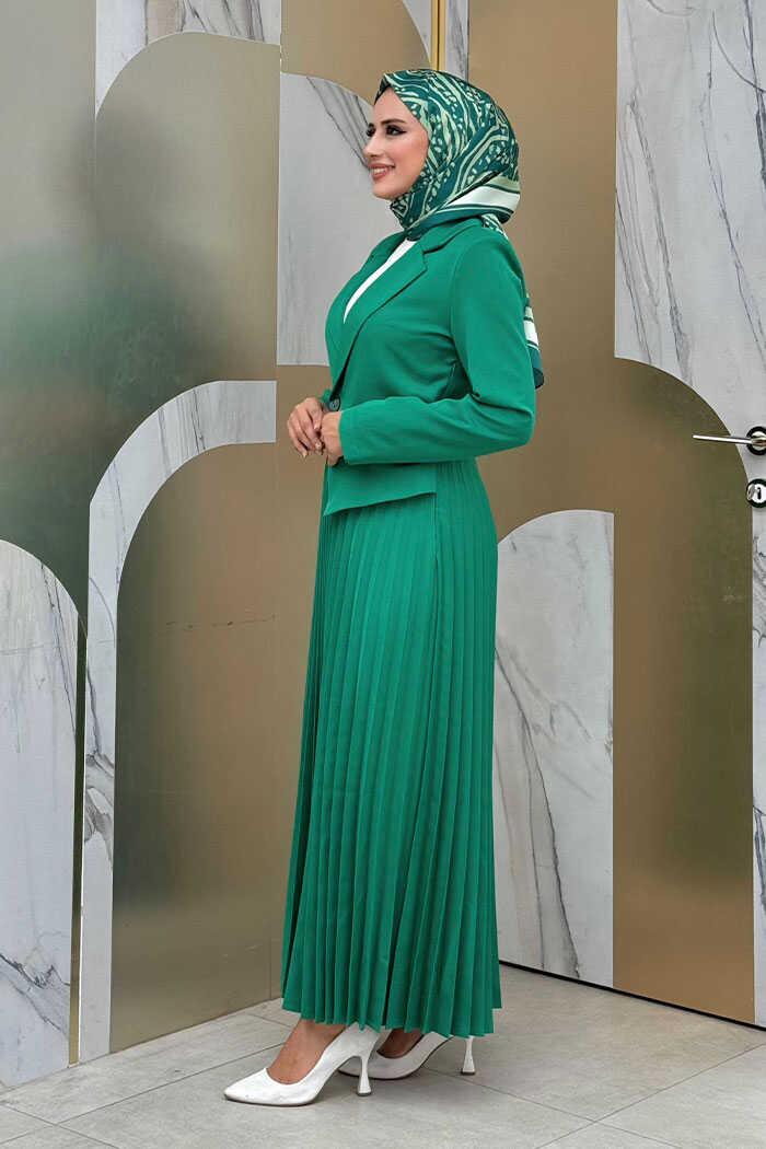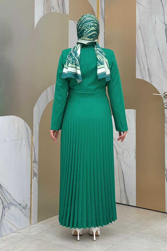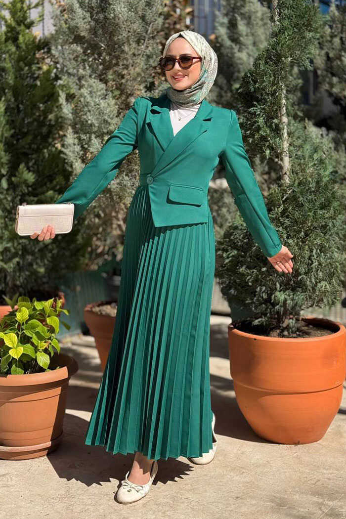 Ceket Görünümlü Eteği Piliseli Elbise 3700 Zümrüt