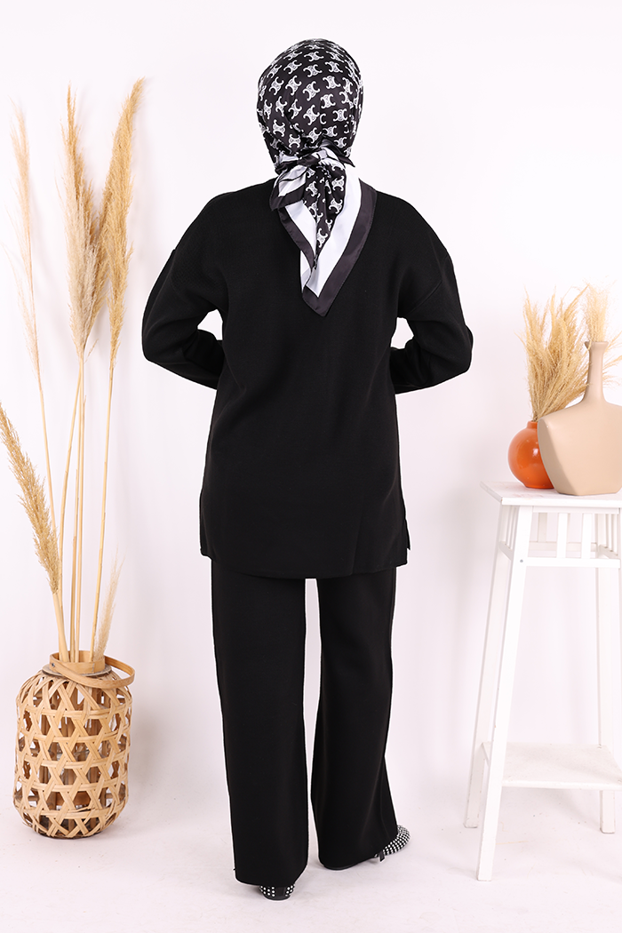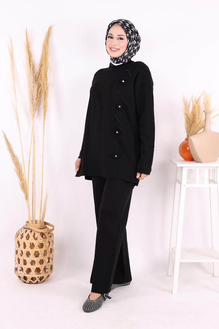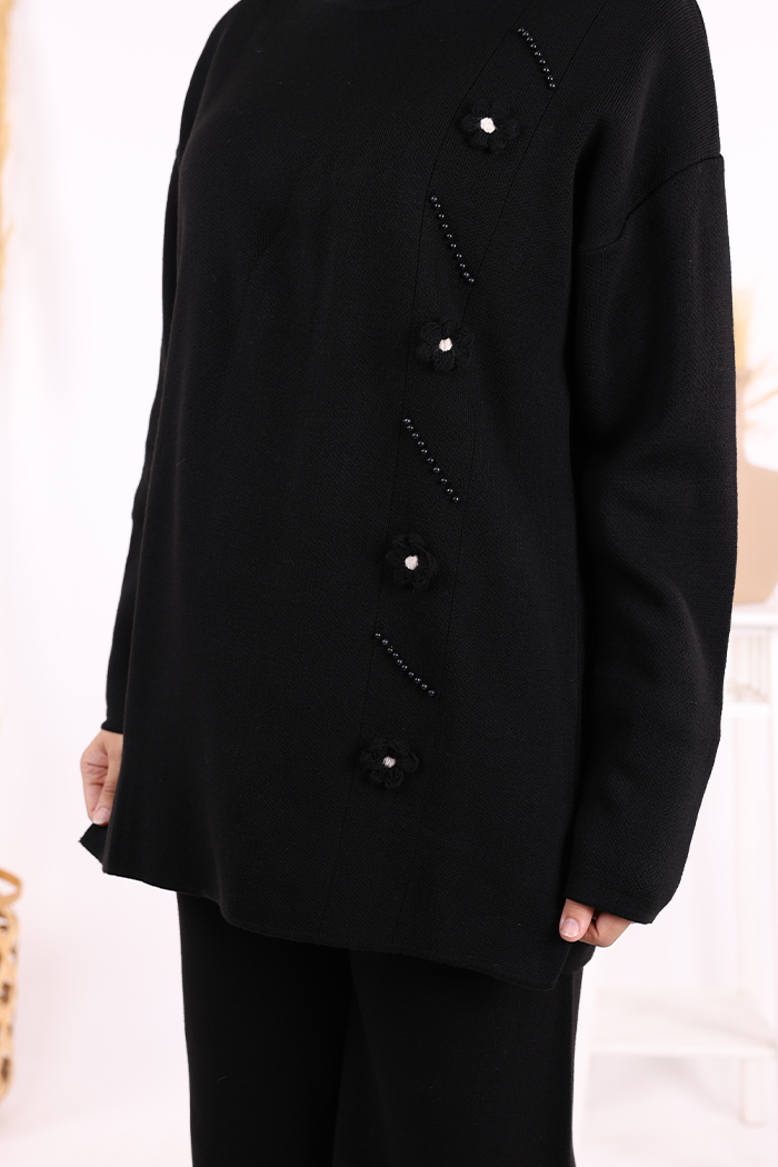 Çiçek Detaylı Triko Takım 1620 Siyah