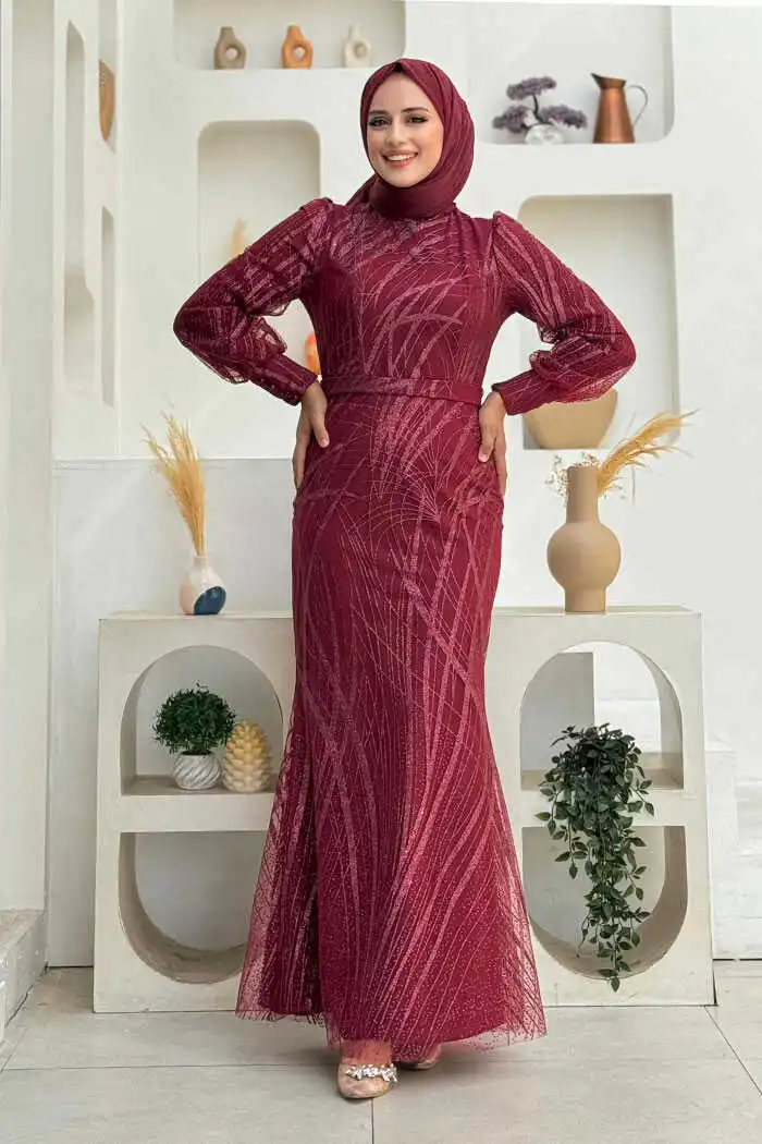Desenli Bel Kemerli Balık Abiye Elbise 1139 Bordo