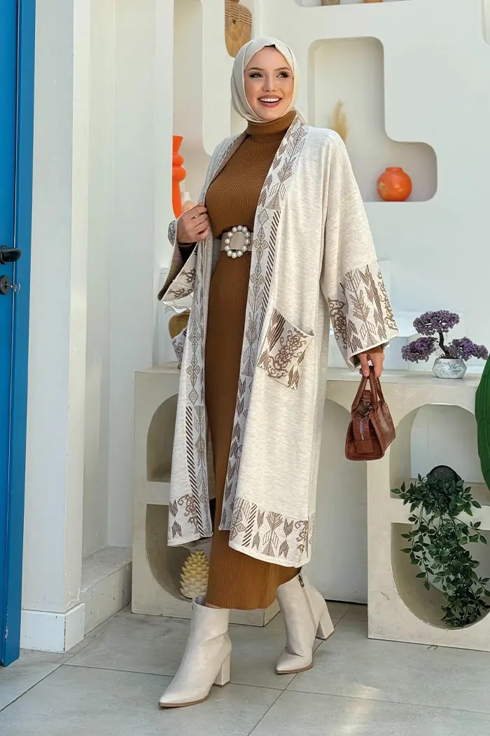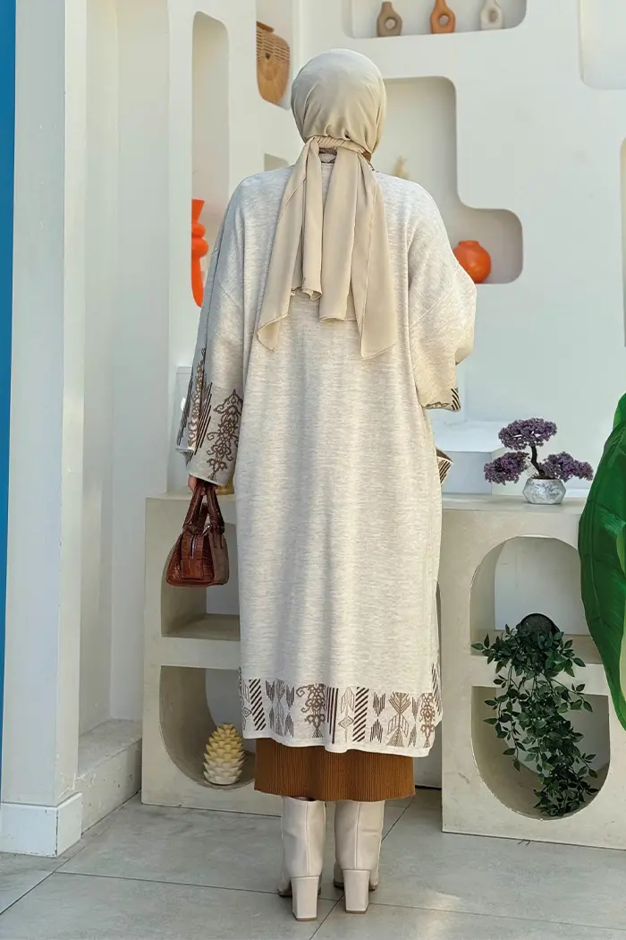 Etnik Desenli Cepli Triko Hırka 12003 Taş