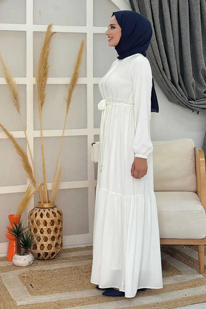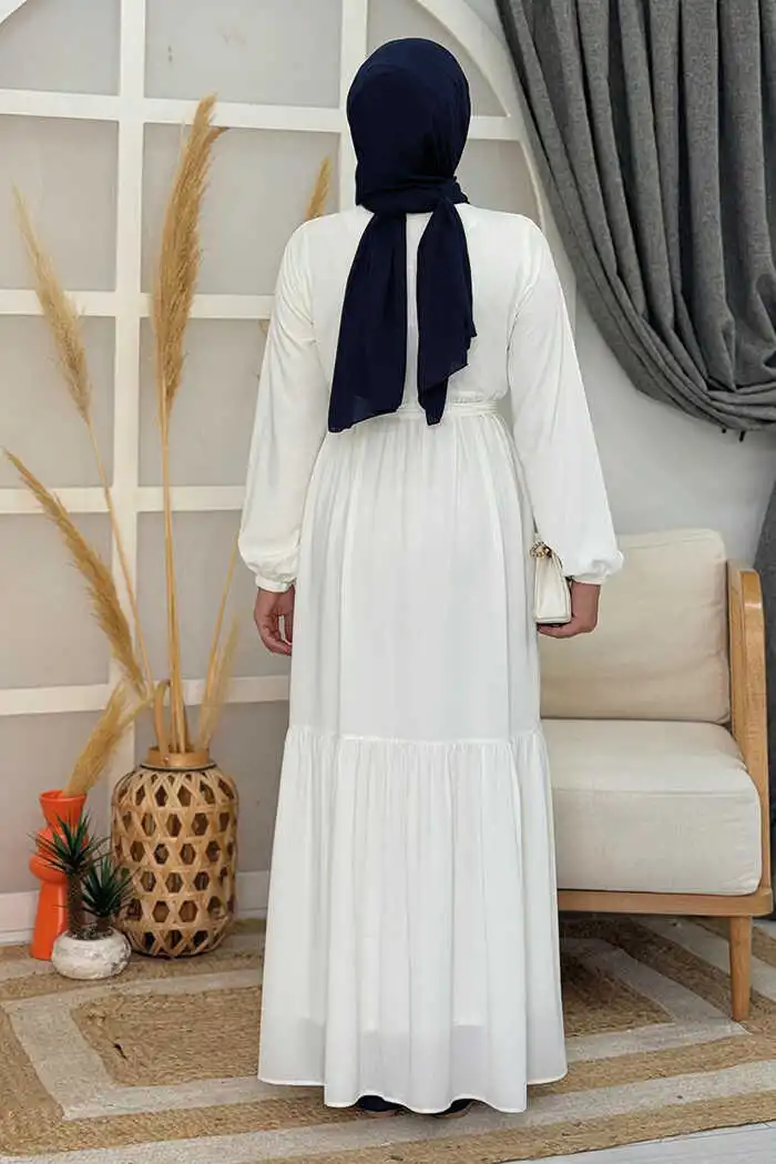 Fermuarlı Kol Manşetleri Lastikli Fırfırlı Elbise 6001 Ekru