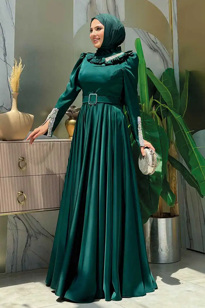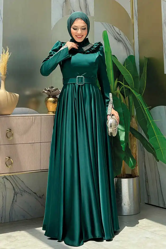 Fırfırlı Taş Detaylı Kemer Aksesuarlı Saten Elbise: