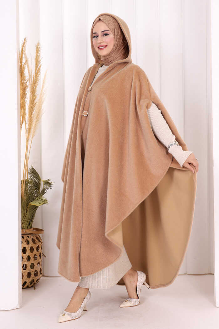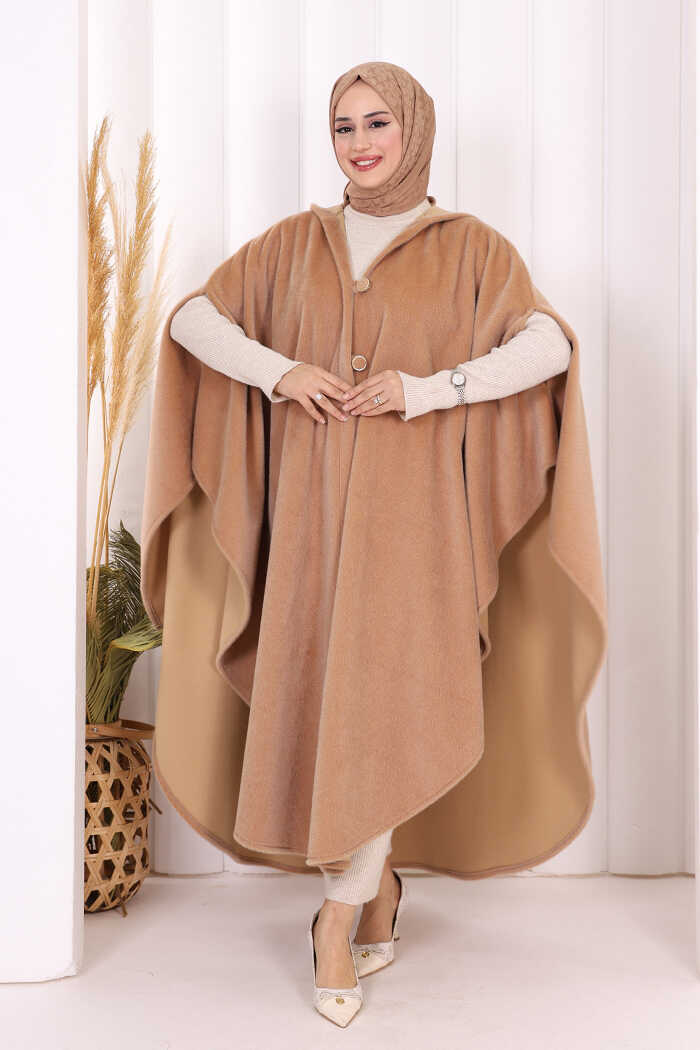 Foks Kumaş Kapşonlu Panço 70130 Vizon