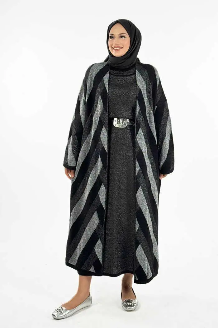 Geometrik Desenli Simli Hırka 18328 Siyah-Gümüş