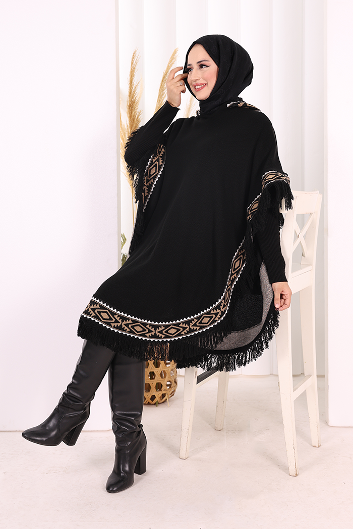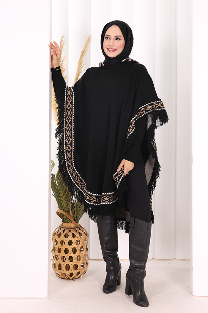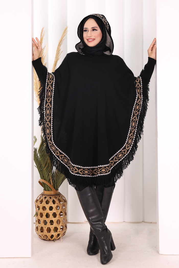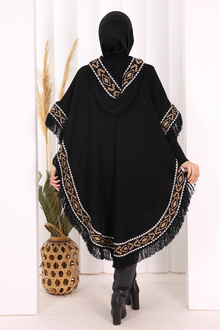 Kapüşonlu Etnik Desen Detaylı Püsküllü Triko Panço 12096 Siyah