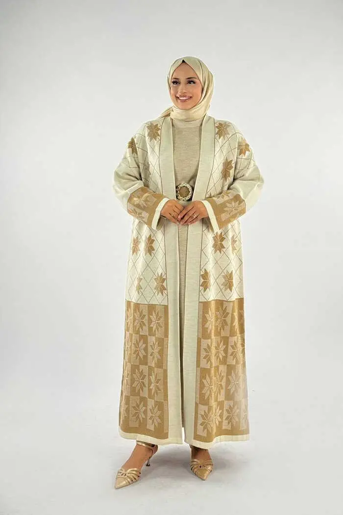 Kar Tanesi Desenli Uzun Triko Hırka 18166 Taş