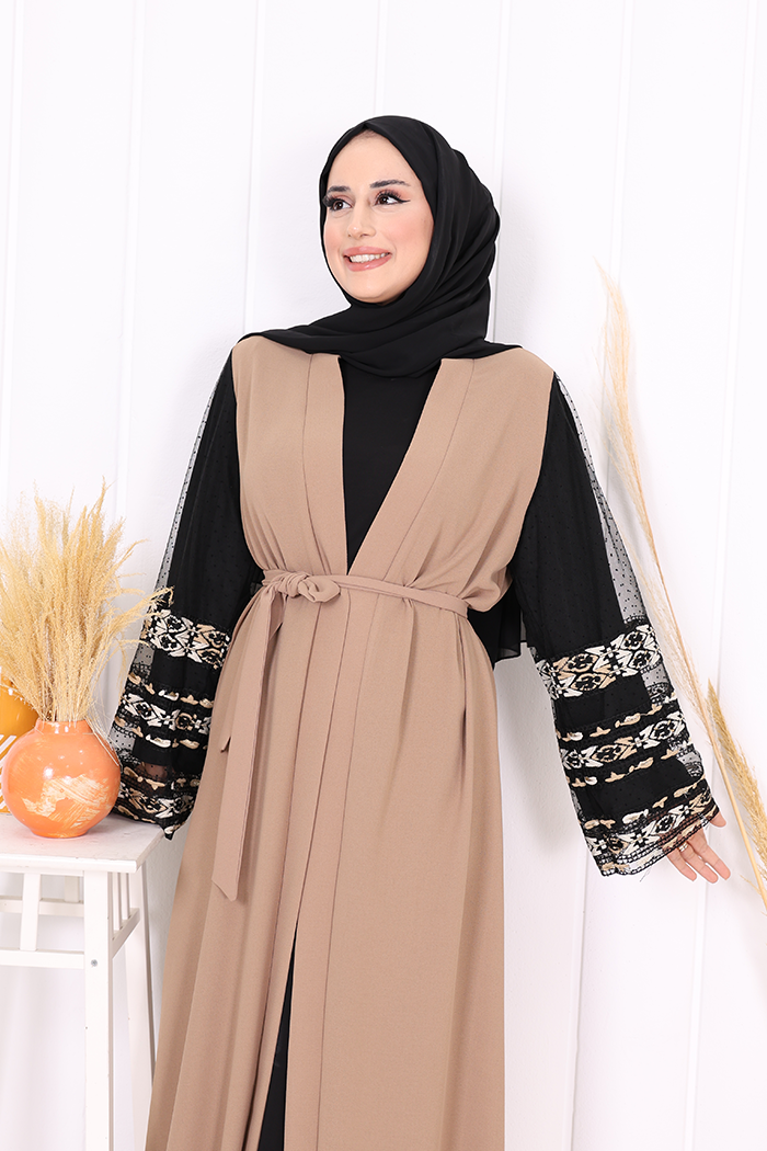 Kol İşlemeli Bel Kuşaklı Abaya 7814 Vizon