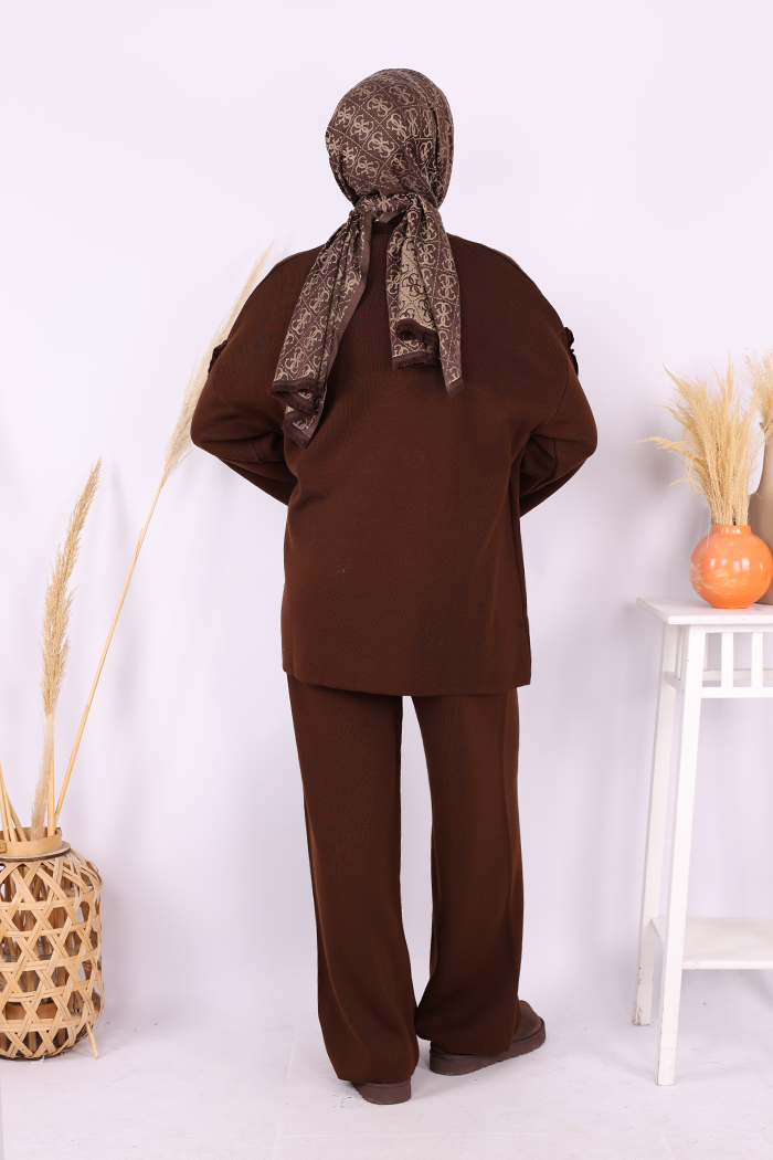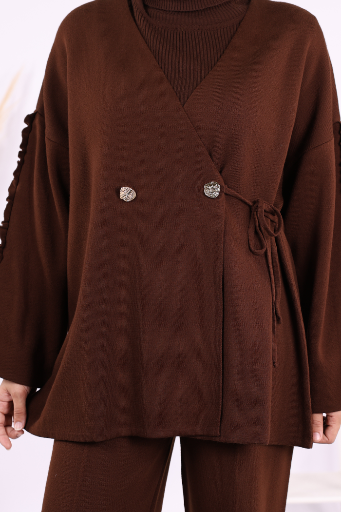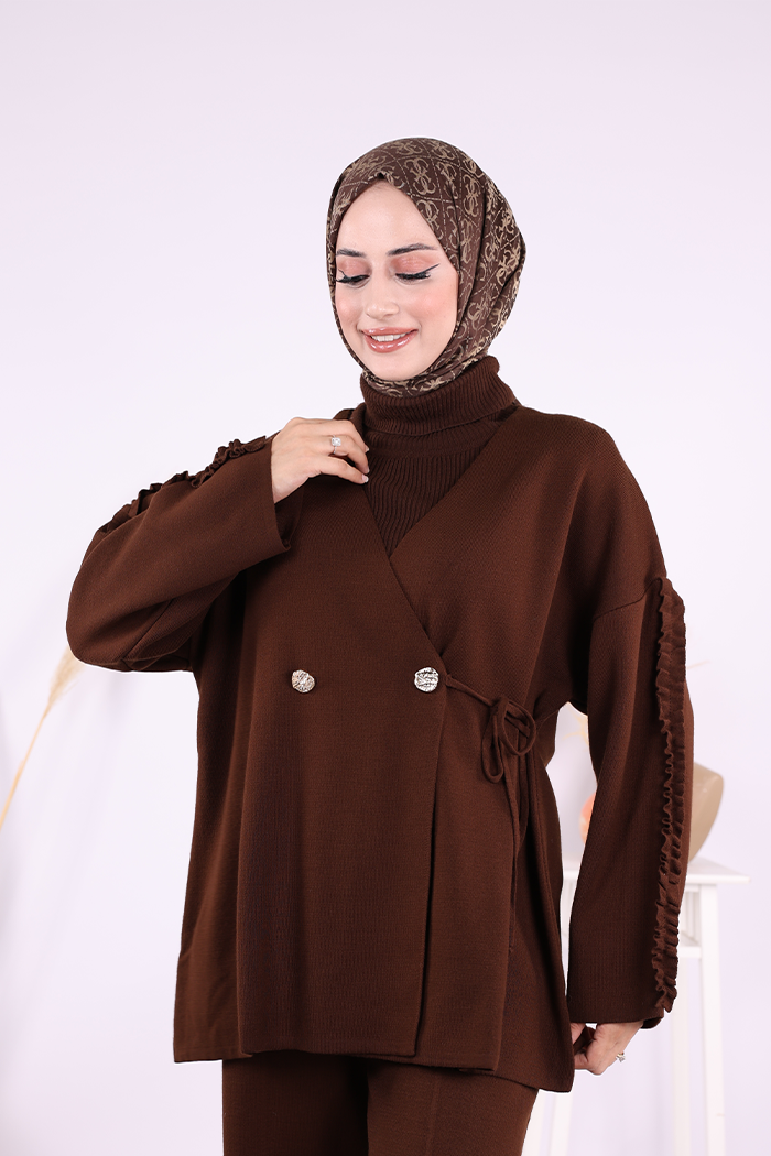 Kolları Fırfırlı Hırka ve Pantolon Takım 17026 Kahverengi