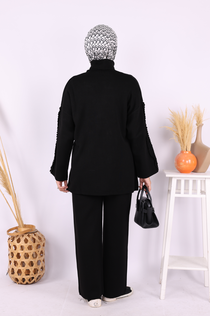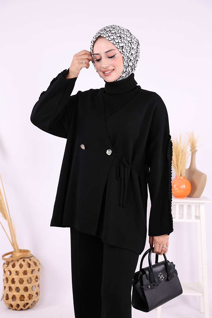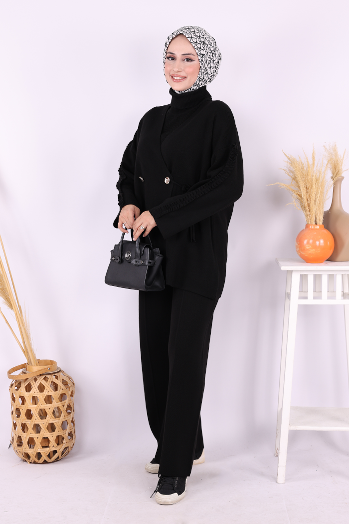 Kolları Fırfırlı Hırka ve Pantolon Takım 17026 Siyah