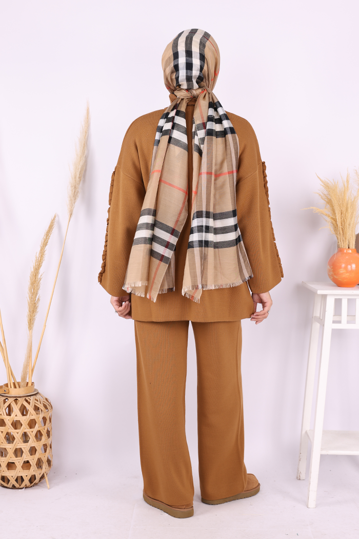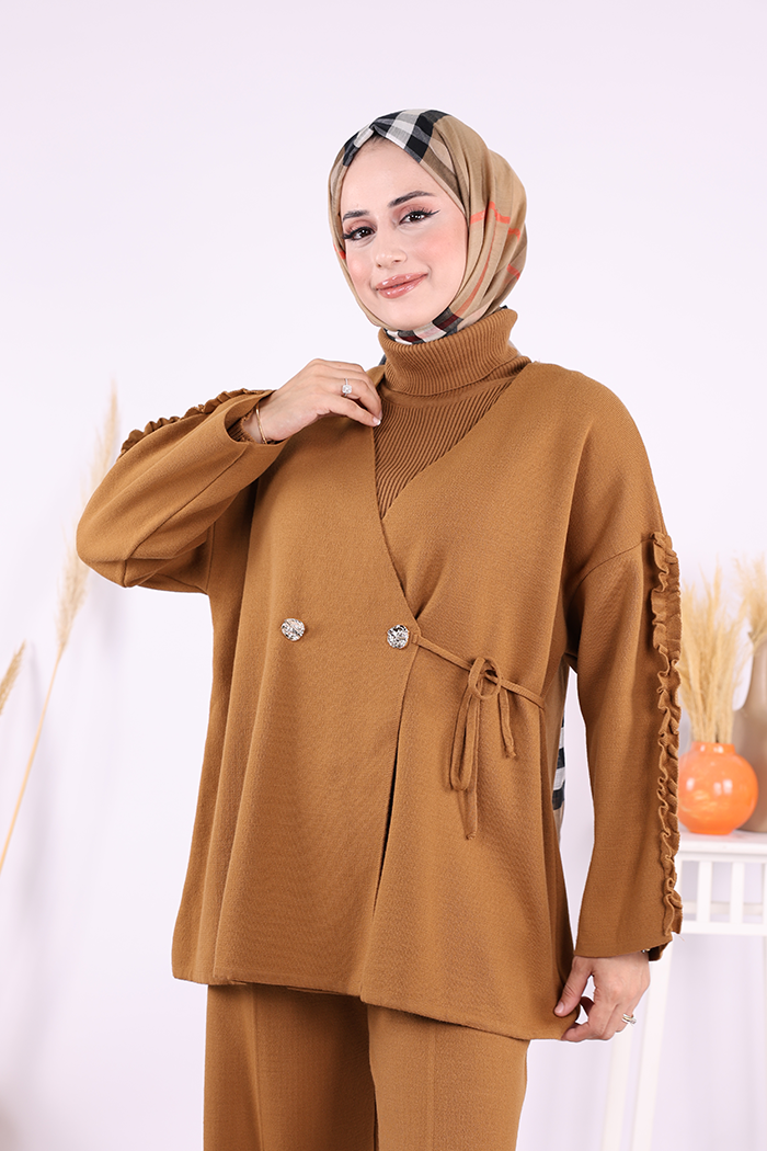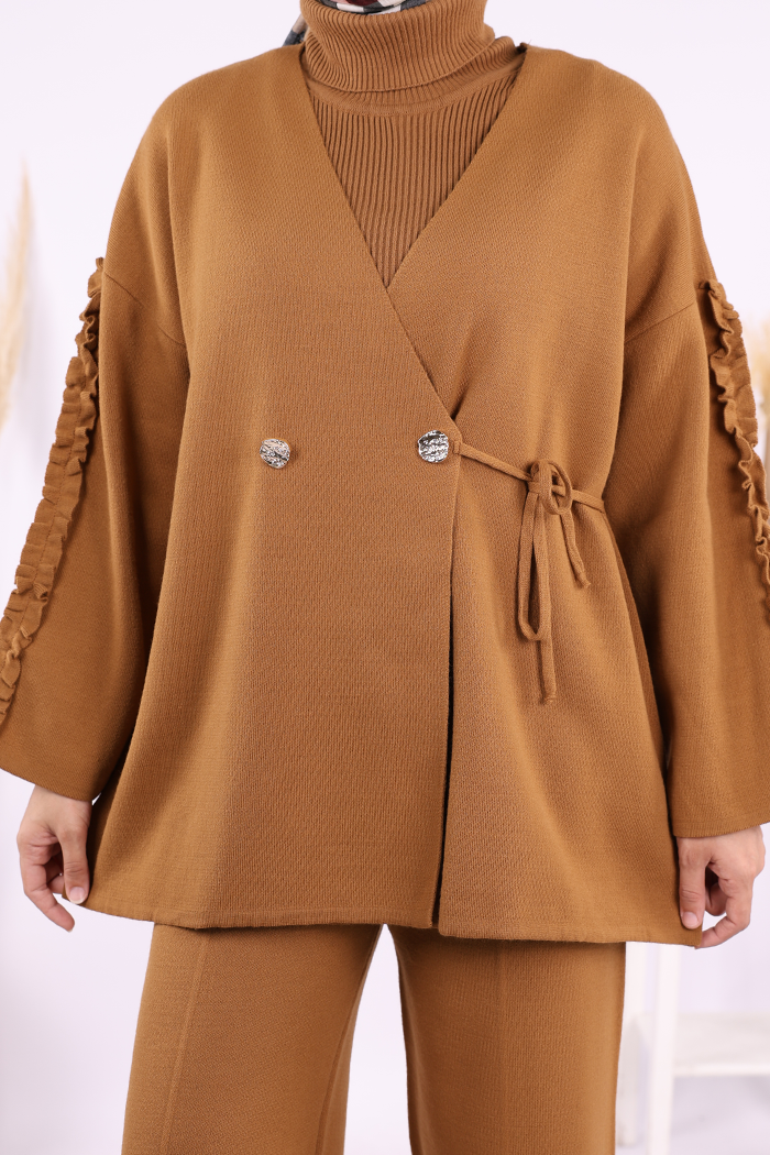 Kolları Fırfırlı Hırka ve Pantolon Takım 17026 Taba