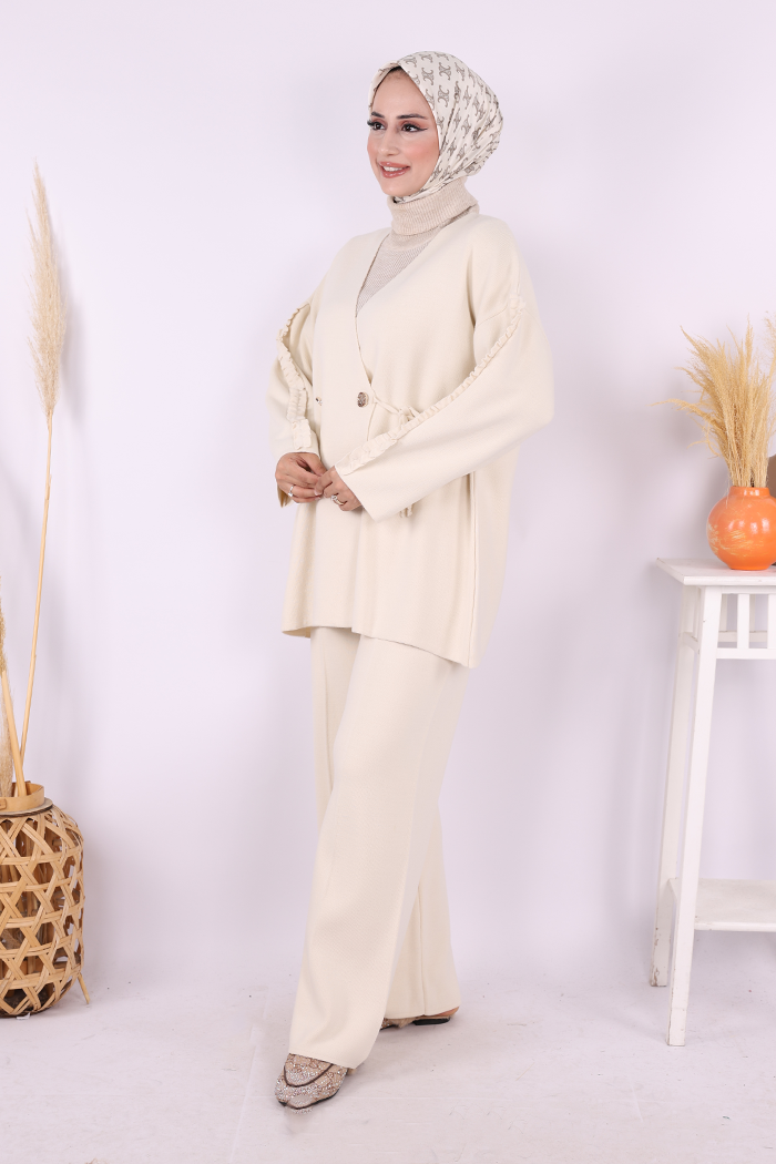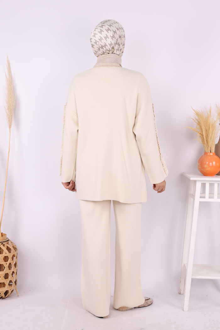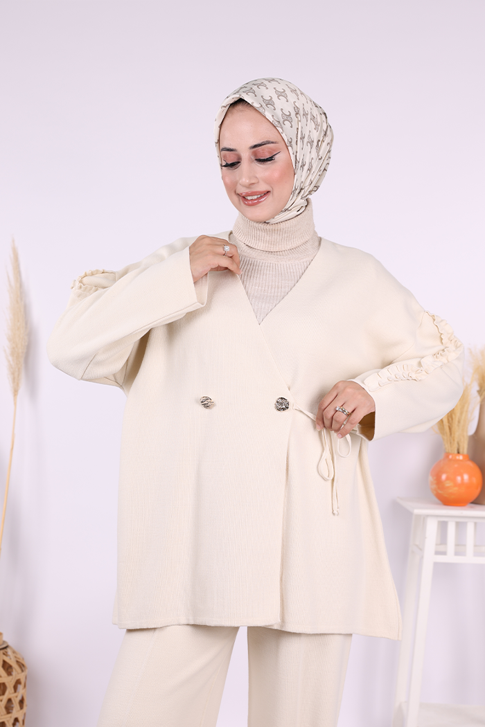 Kolları Fırfırlı Hırka ve Pantolon Takım 17026 Taş