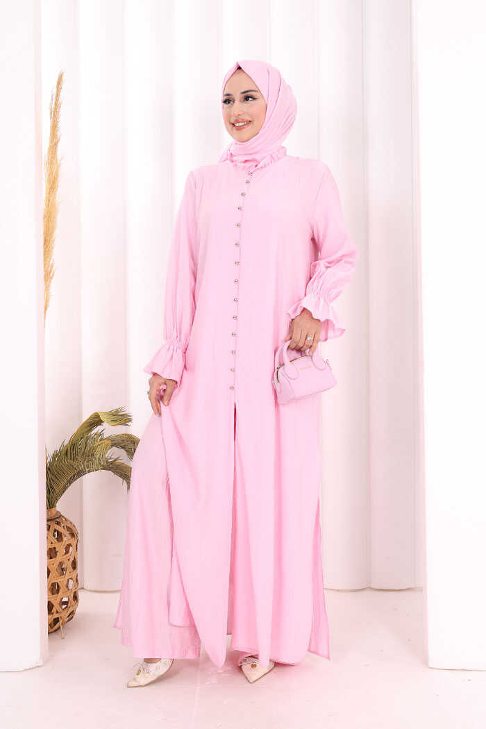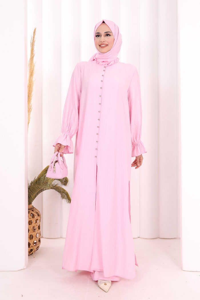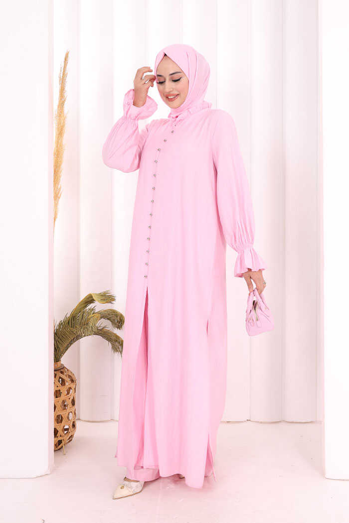 Hac Umre Takım Önü Düğmeli Tunik,Pantolon ŞAL HEDİYE 8014 Pembe